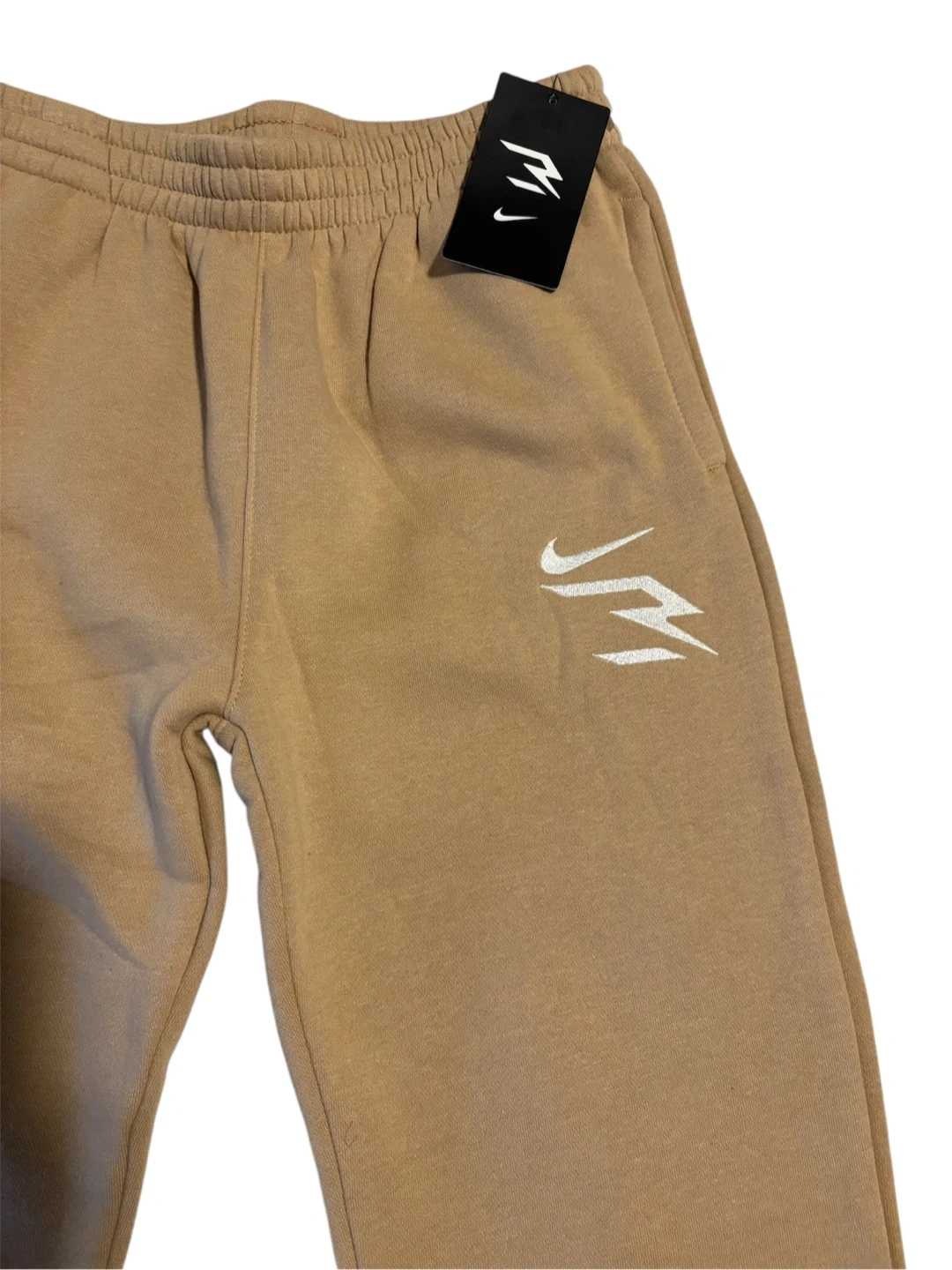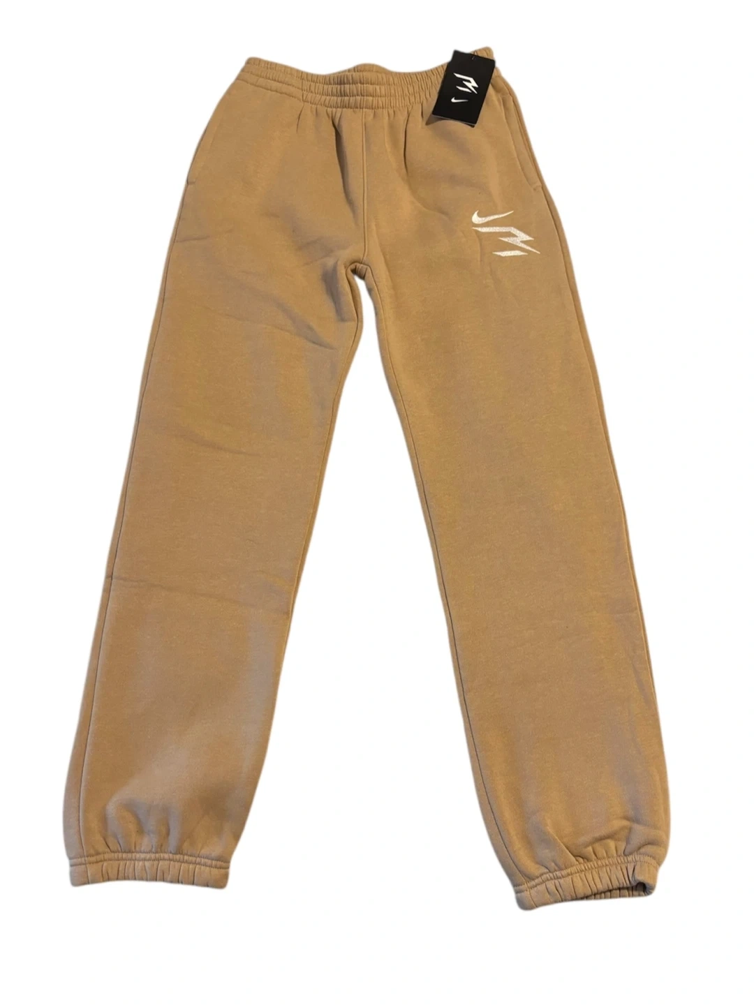 These are 3BRAND boys' jogger sweatpants. They're a size large in a tan color. Made in Egypt. Cotton blend material.