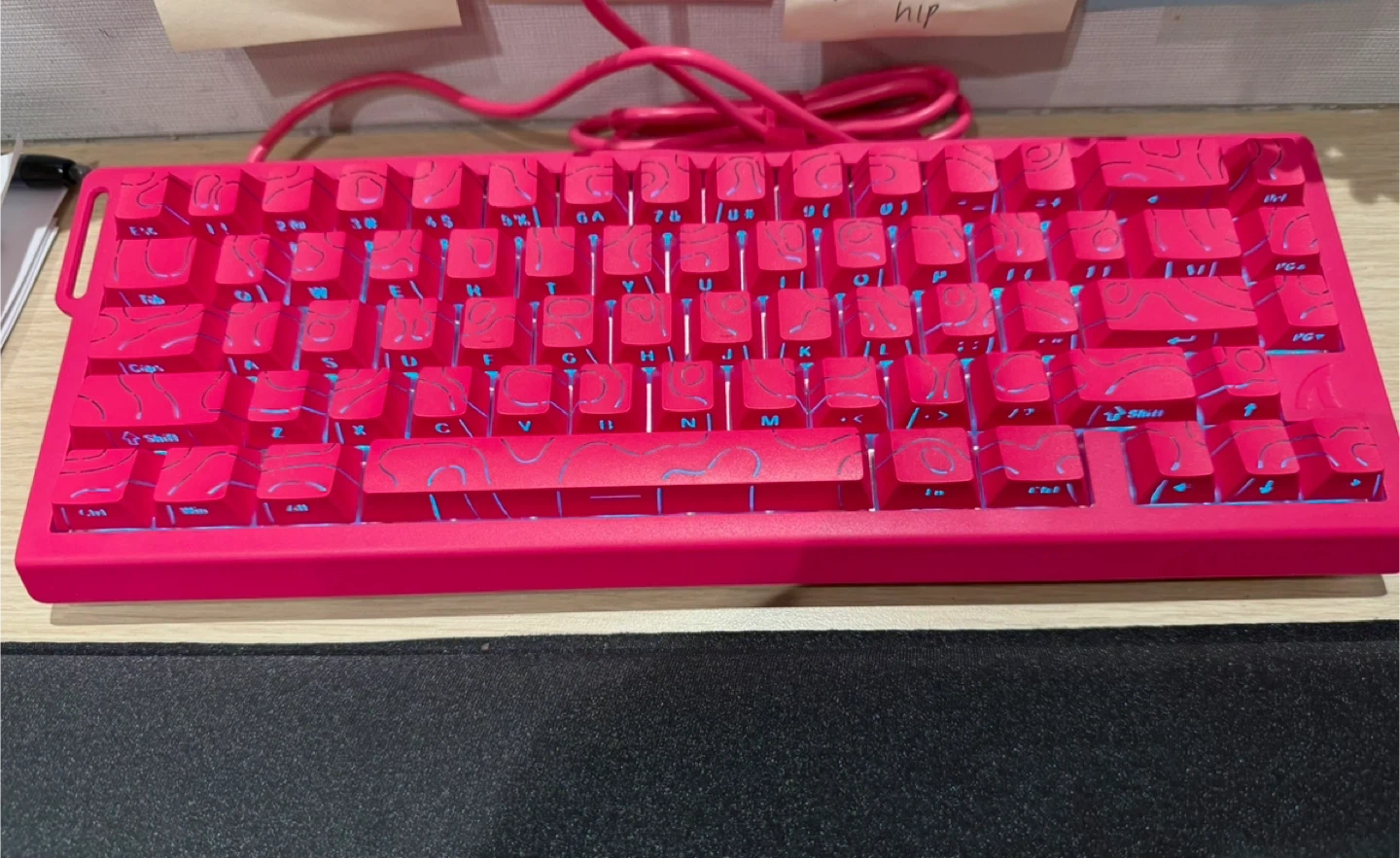 This is a vibrant pink mechanical keyboard. It features unique blue abstract line designs on the keycaps. The keyboard includes a braided pink USB cable.