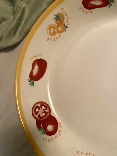 A beautiful serving bowl from Pottery Barn with tomatoes around the sides. Perfect for serving pasta, salads, veggies, potatoes, etc. A few very tiny chips from use but nothing particularly noticeable. Very Italian country.
