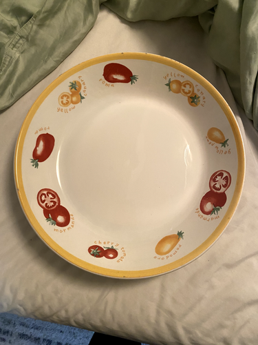 A beautiful serving bowl from Pottery Barn with tomatoes around the sides. Perfect for serving pasta, salads, veggies, potatoes, etc. A few very tiny chips from use but nothing particularly noticeable. Very Italian country.