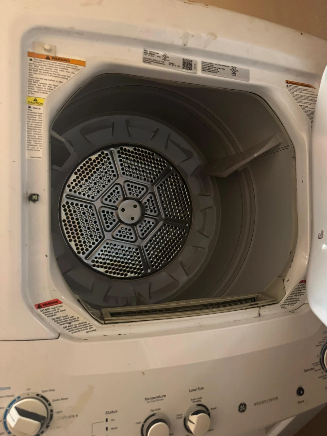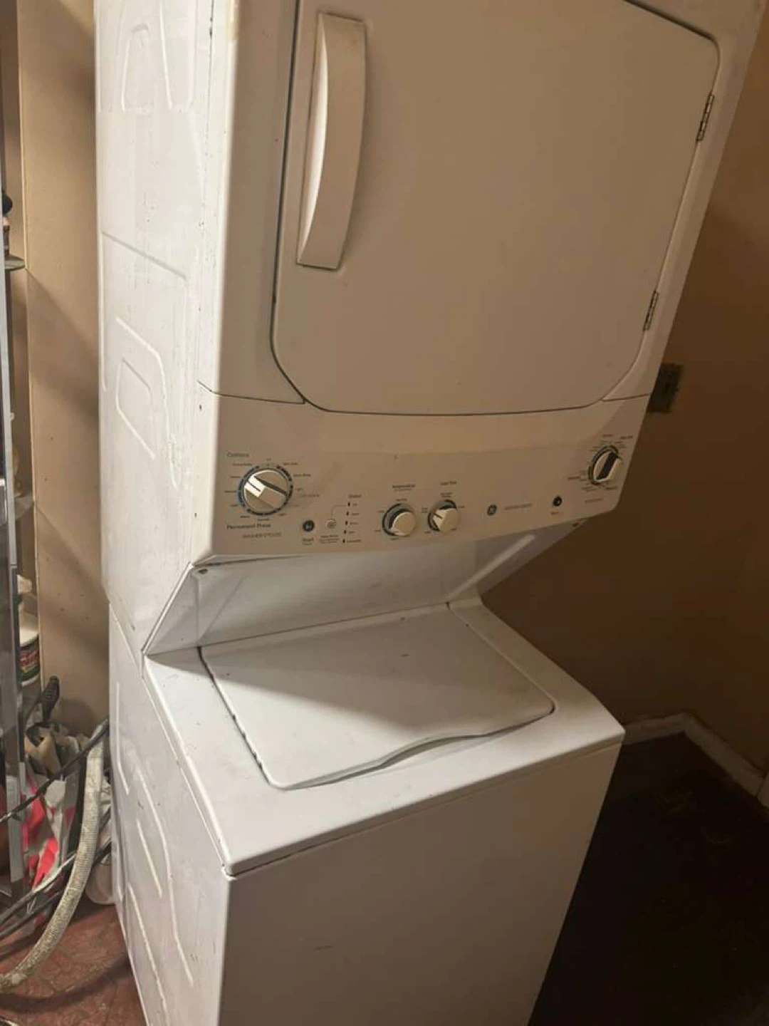 White GE stackable washer and dryer unit. Top-loading washer with multiple cycle options. Front-loading dryer.