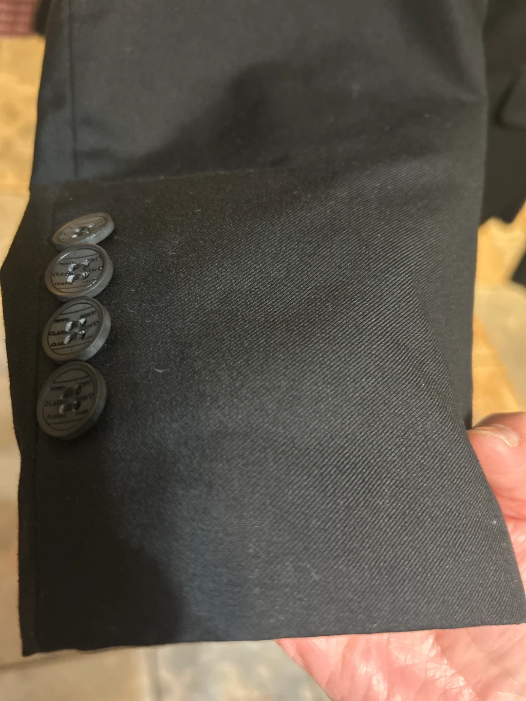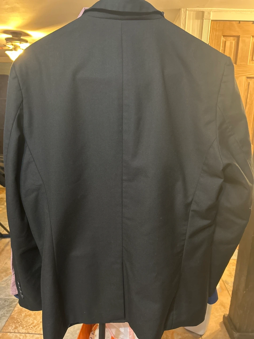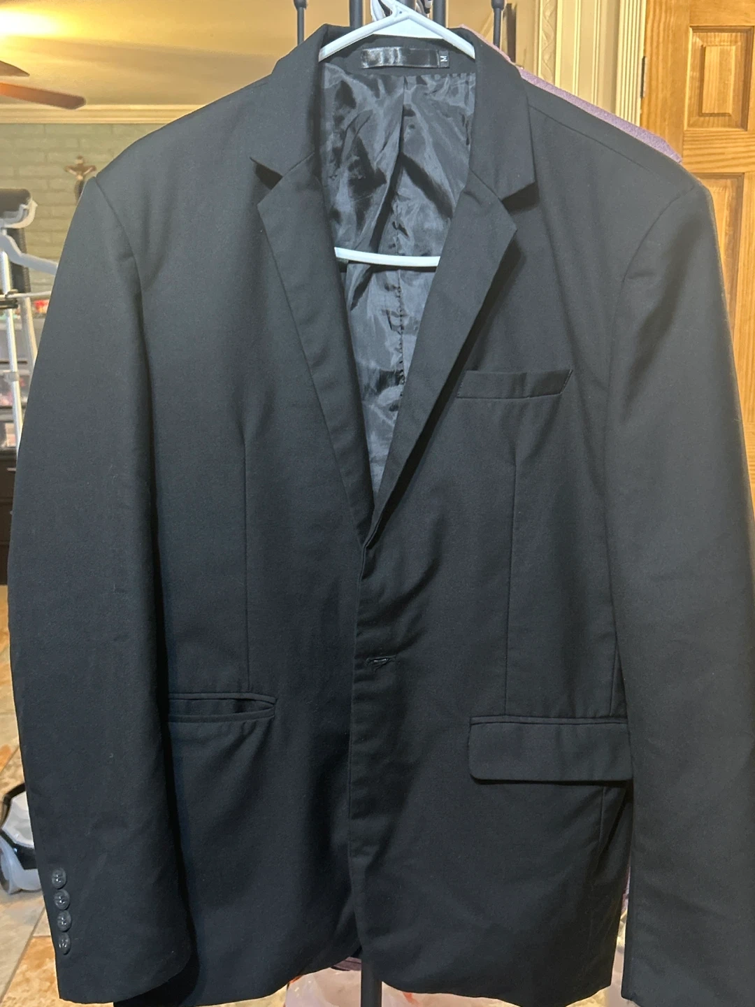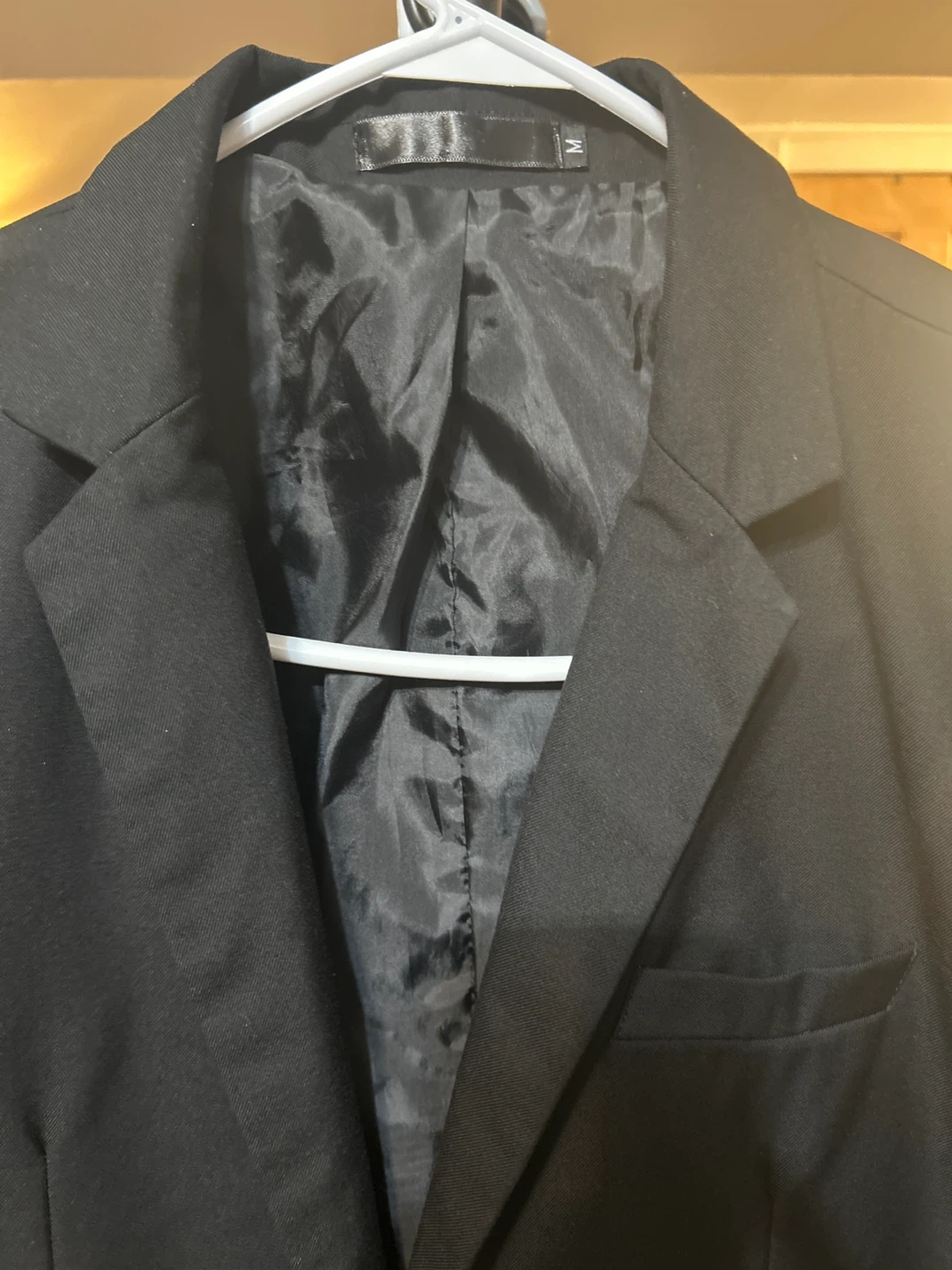 Selling a black blazer in size M. It's in great condition and ready for a new owner! The material is durable and the color is a classic black, making it versatile for different occasions