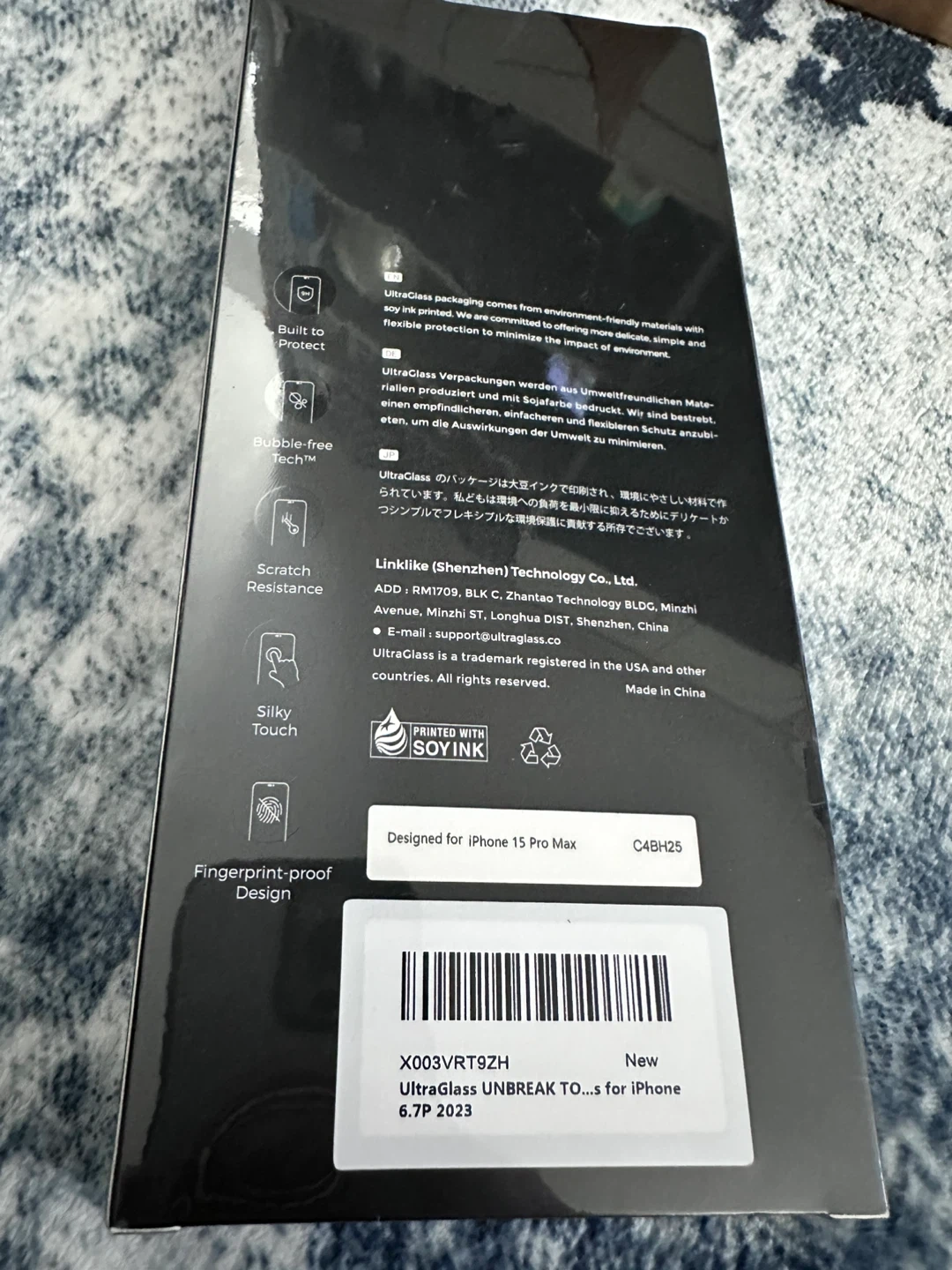 This UltraGlass screen protector is designed for the iPhone 15 Pro Max. It's built to protect against scratches and fingerprints. Features include bubble-free tech and a silky touch finish.