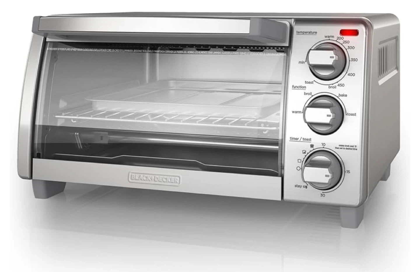 This is a Black+Decker toaster oven. It has a temperature dial that goes up to 450 degrees Fahrenheit. There are settings for toast, broil, bake, and warm.