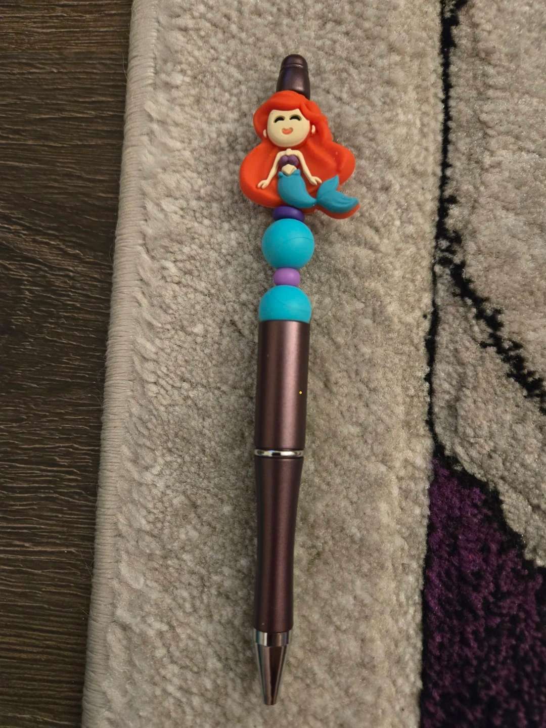 This pen features a cute Ariel figurine on top and colorful beads along the barrel. It's a fun writing tool! The pen's body is a metallic purple.