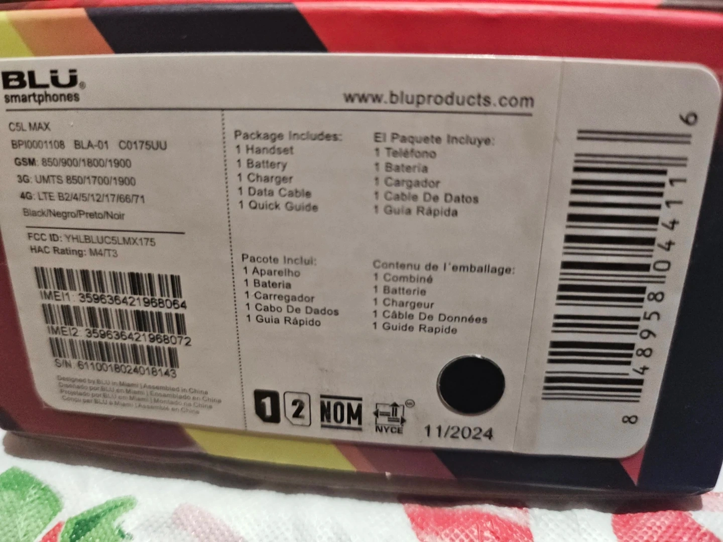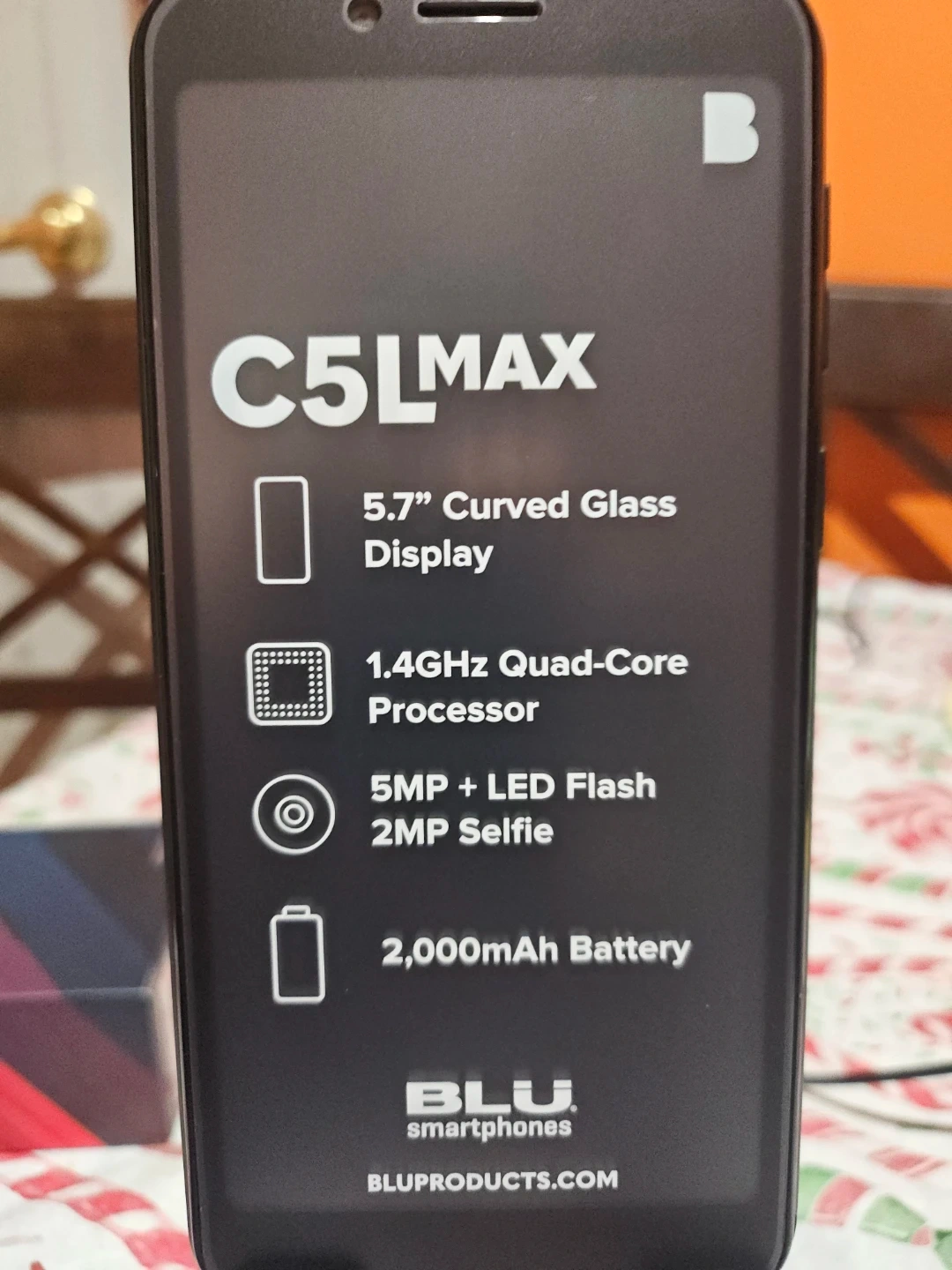 BLU C5L MAX smartphone in black. It's powered by Android 13 and has a 1.4GHz Quad-Core processor. Features a 5.7" curved glass display, 5MP main camera with LED flash, and a 2,000mAh battery. Includes charger, cable, and quick guide.