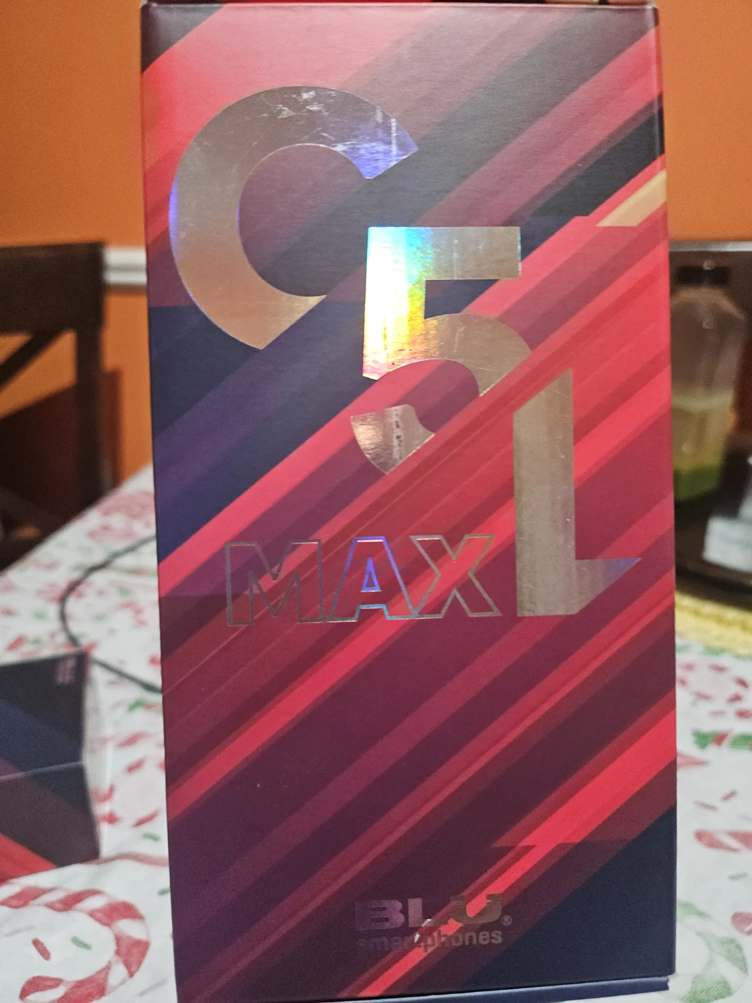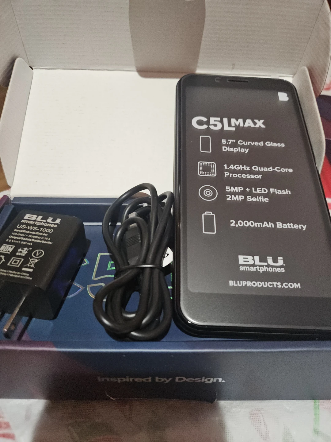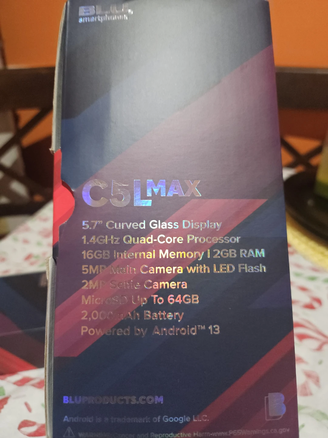 BLU C5L MAX smartphone in black. It's powered by Android 13 and has a 1.4GHz Quad-Core processor. Features a 5.7" curved glass display, 5MP main camera with LED flash, and a 2,000mAh battery. Includes charger, cable, and quick guide.