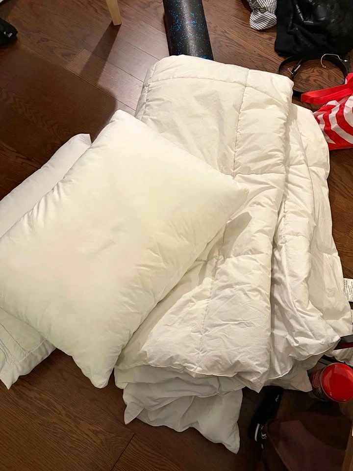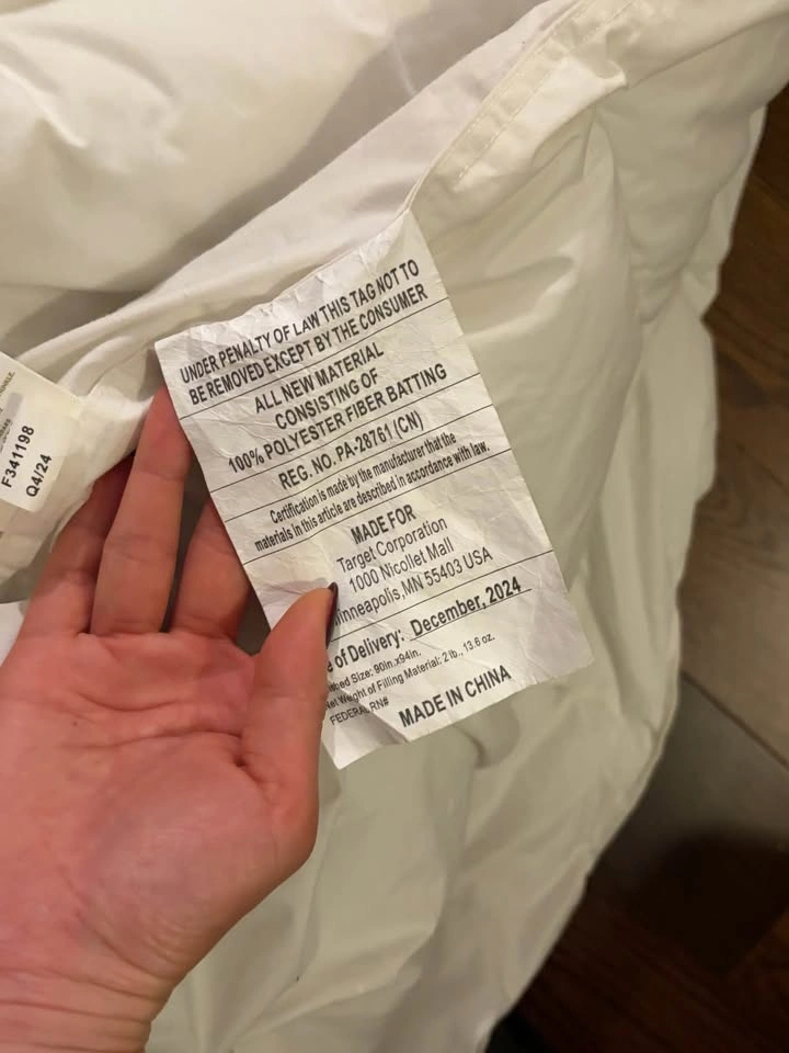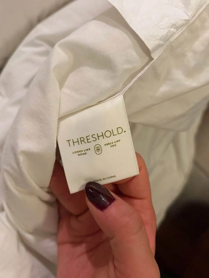 Clean Threshold comforter. Comforter shell has 60% cotton and 40% recycled polyester. Fill is 100% polyester fiber batting. Comforter size is 90in x 94in. Barely used like new. Hotel style thick comforter.