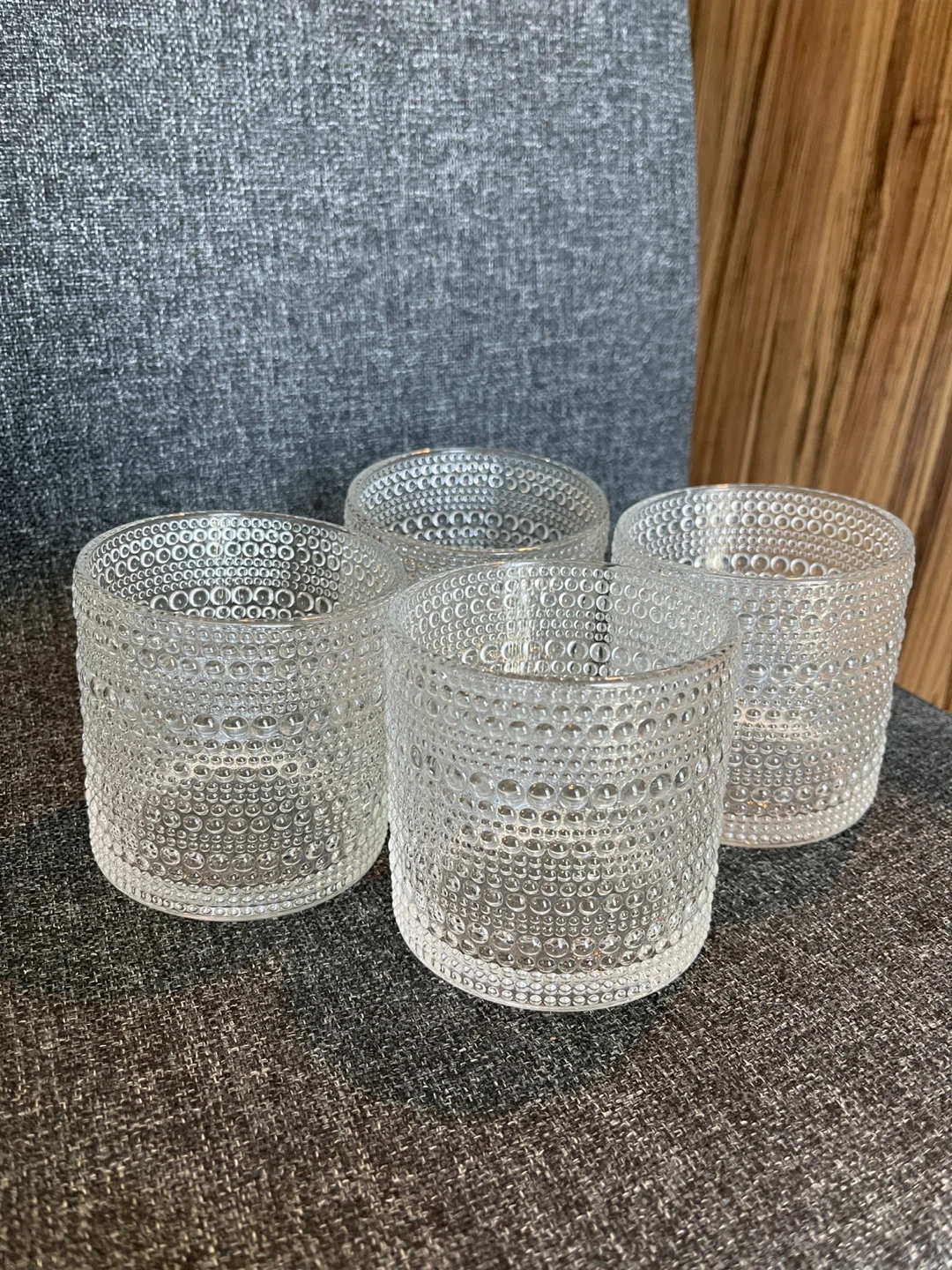 This set includes four clear drinking glasses with a textured bubble pattern.