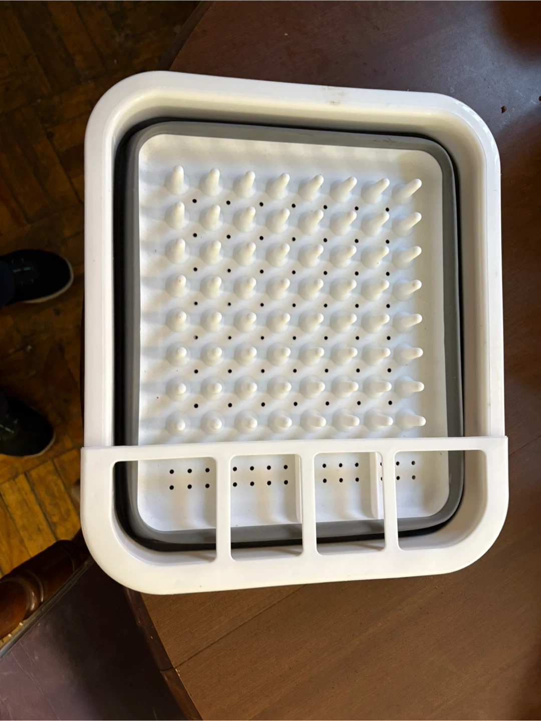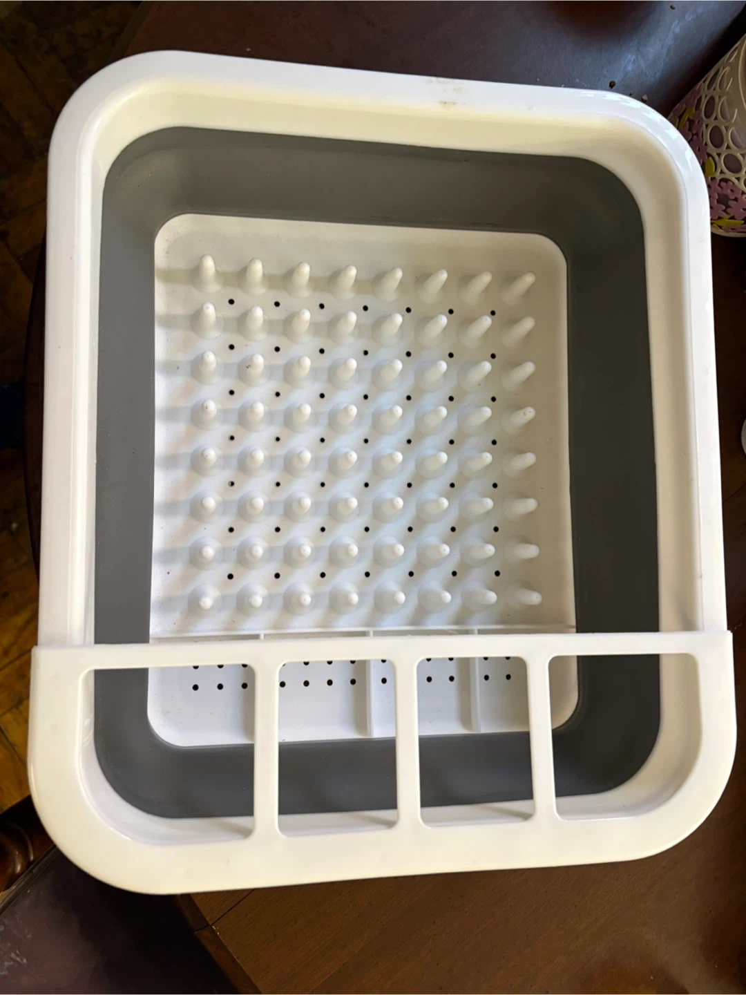 This collapsible dish drying rack is white and grey. It's made of plastic. It's great for drying dishes when space is limited!