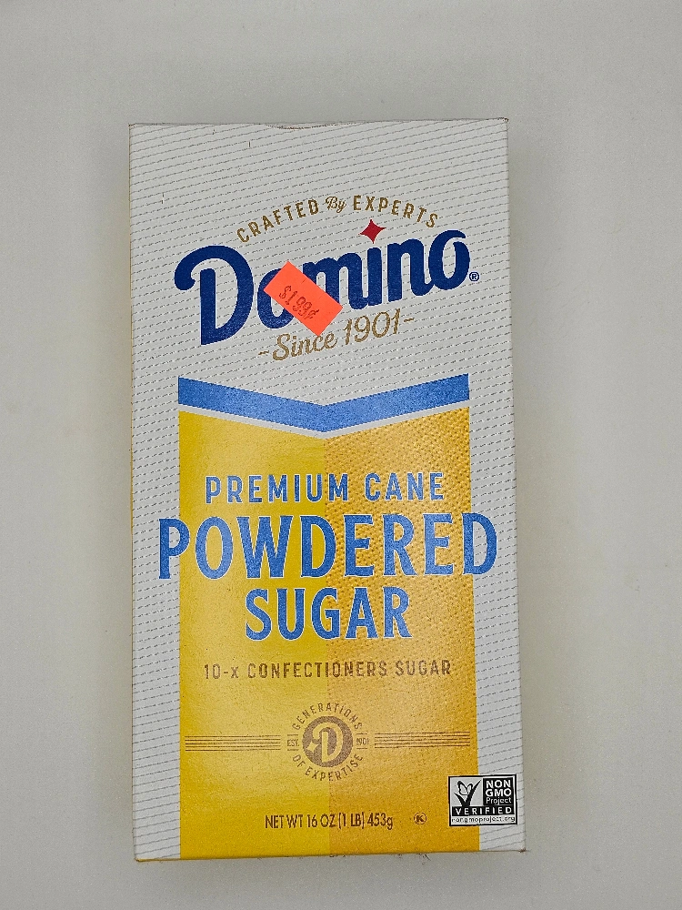 Box of powdered sugar. Features a yellow and blue design. A great ingredient for baking sweet treats, or dusting desserts.