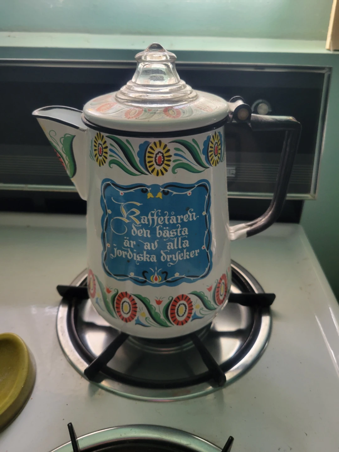 Here's a vintage enamel coffee pot with a charming design! It features a white background adorned with colorful floral patterns and a blue decorative text panel. A unique piece for your kitchen or collection