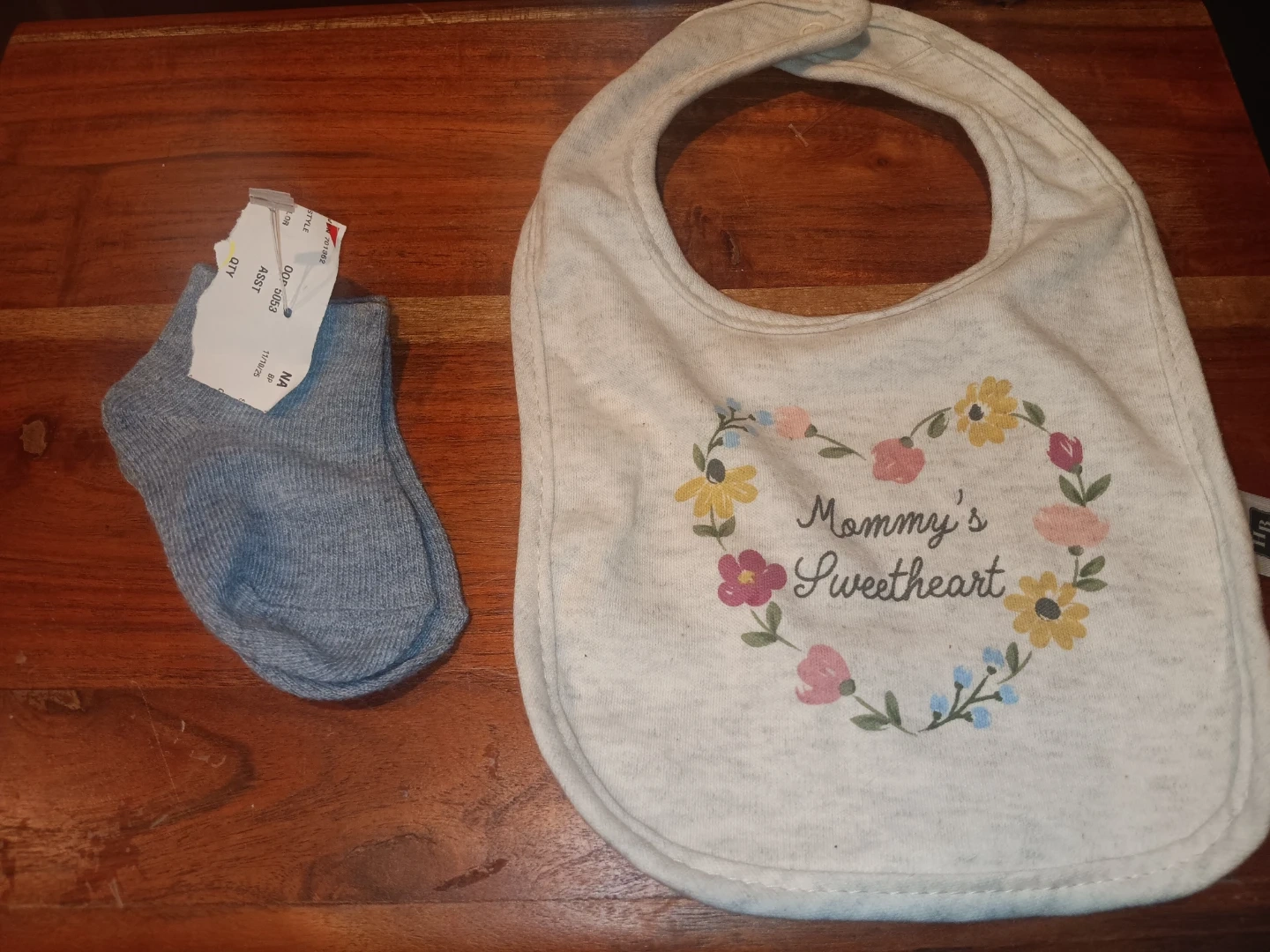 Baby bib with "Mommy's Sweetheart" floral heart design. Includes a pair of grey baby socks. Soft fabric for comfort.