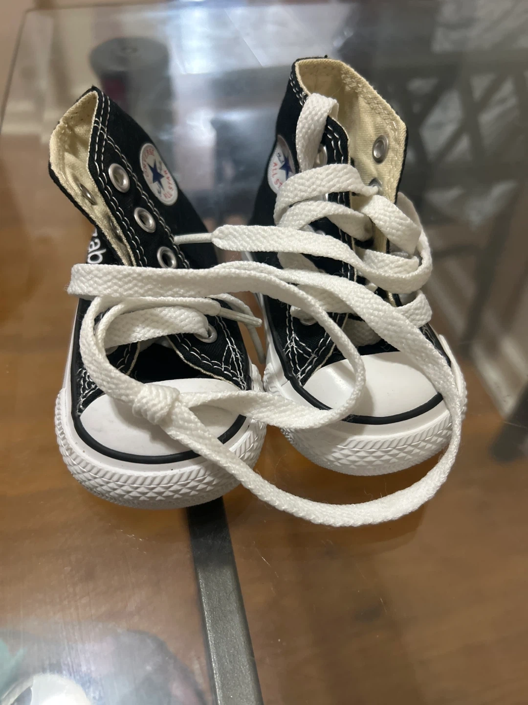 Classic black Converse Chuck Taylor high top sneakers. Canvas upper with rubber sole. Lace-up closure. These iconic sneakers are perfect for everyday wear!