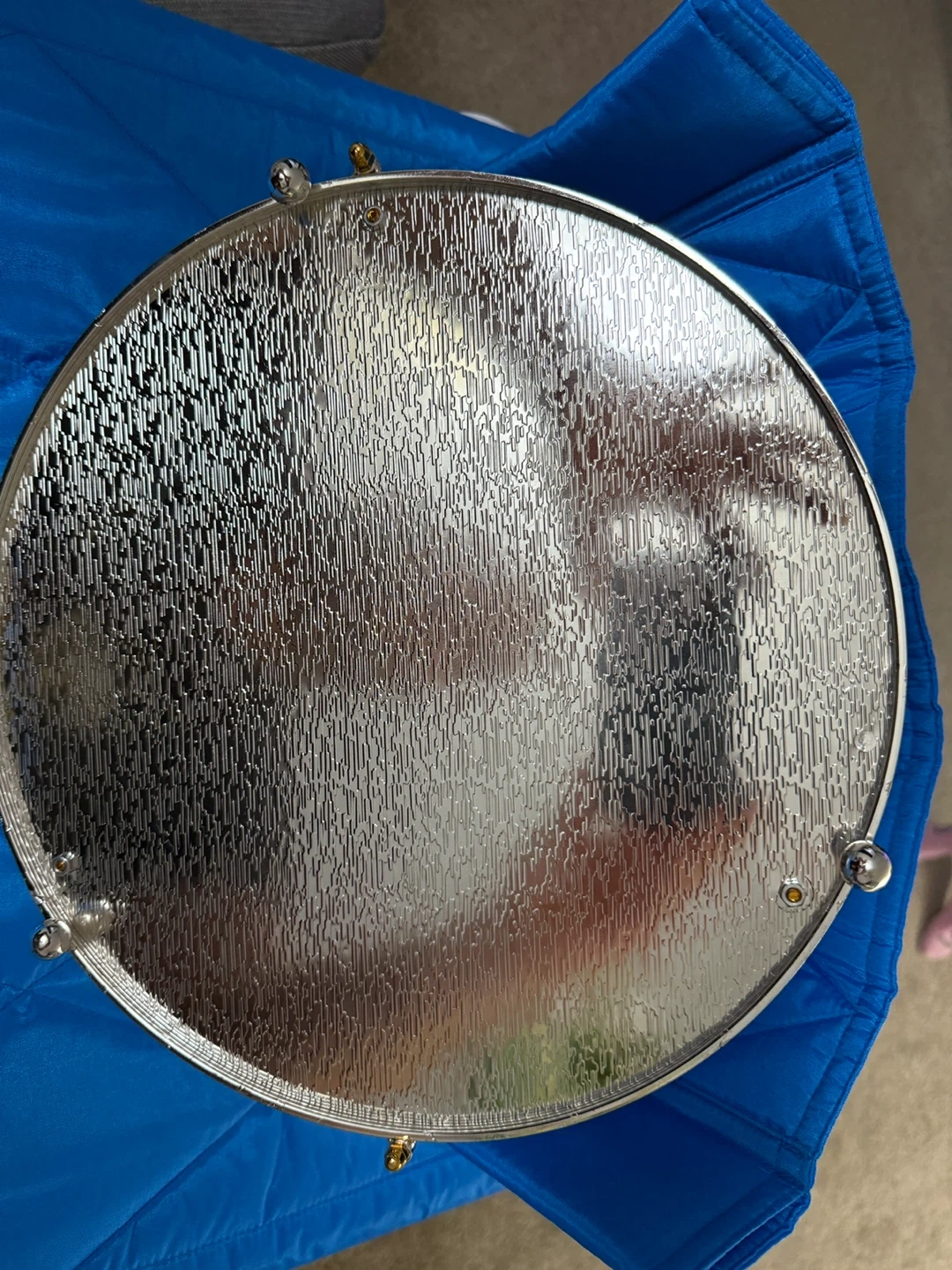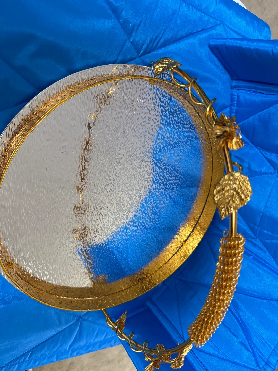 Selling a beautiful decorative tray with gold accents and a silver surface! It has a handle and ornate details around the rim. Perfect for adding a touch of elegance to your home decor