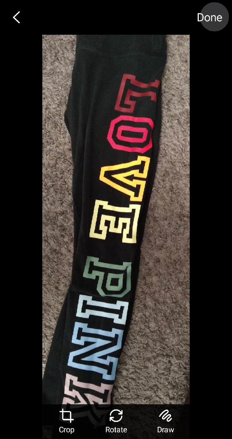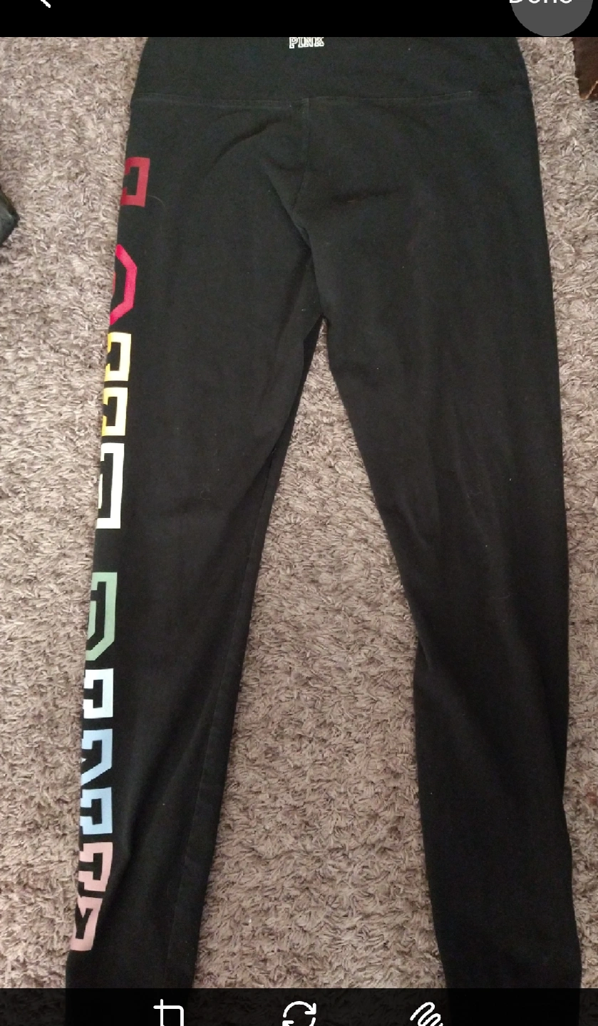 Selling a pair of PINK Victoria's Secret Sport leggings in size M. They're black with the word "LOVE PINK" down the side in rainbow colors. The material is 87% cotton and 13% elastane, making them super comfy for workouts or just lounging around