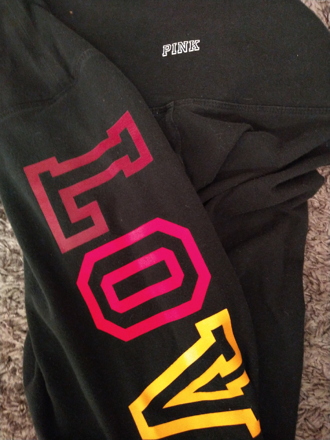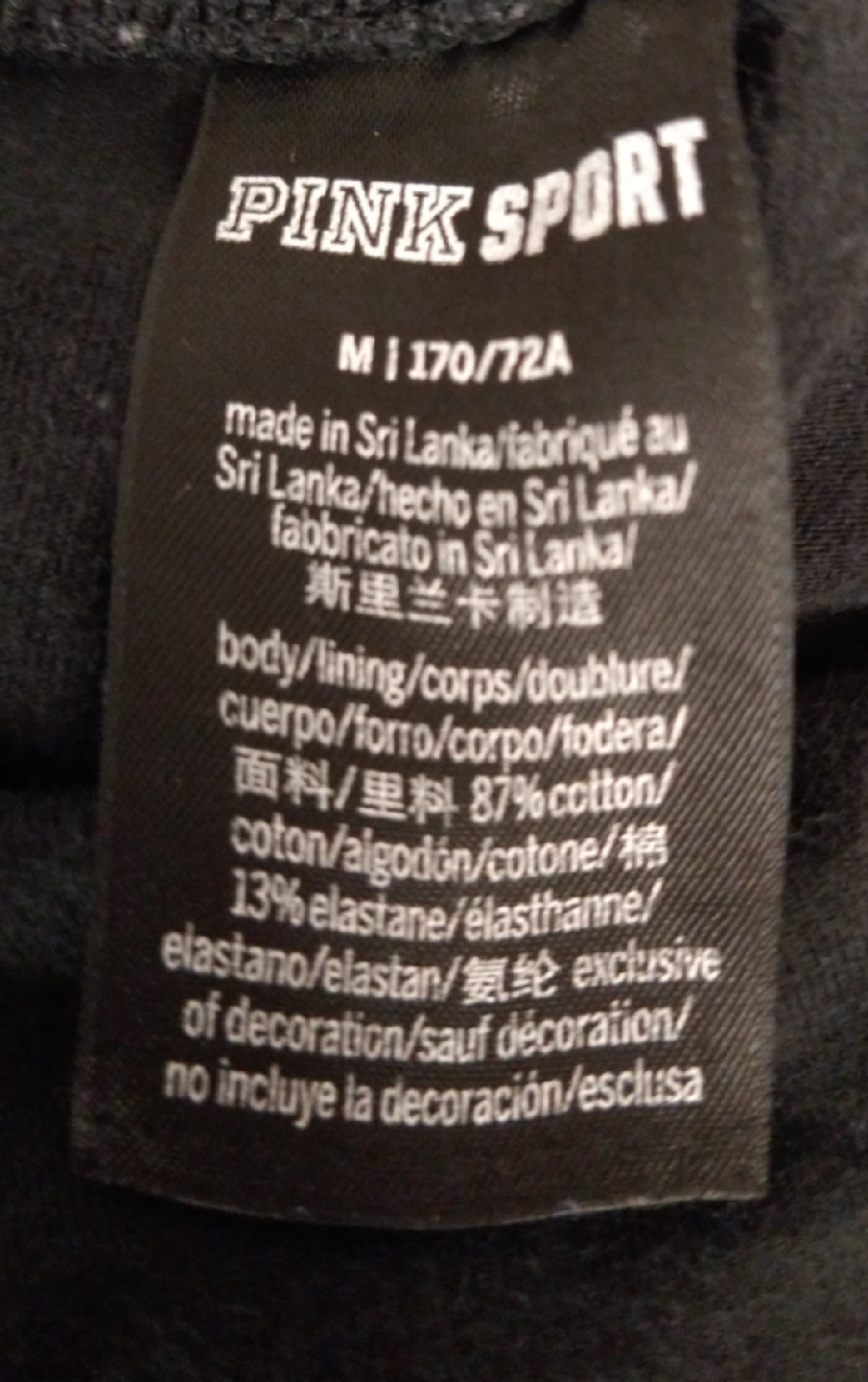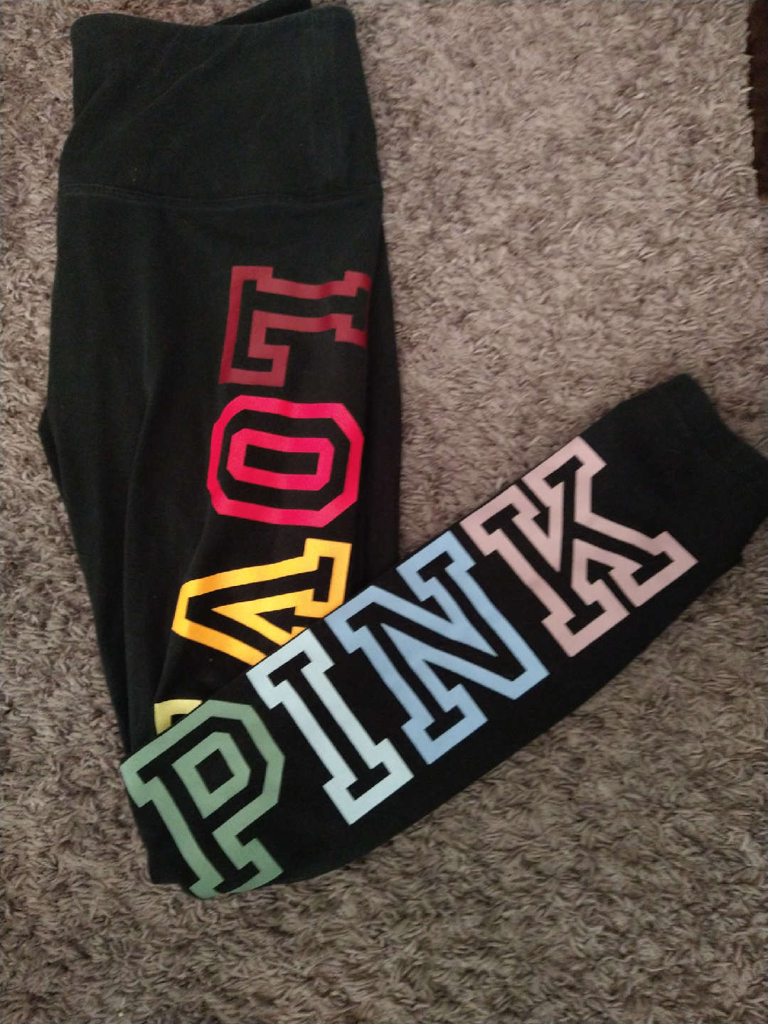 Selling a pair of PINK Victoria's Secret Sport leggings in size M. They're black with the word "LOVE PINK" down the side in rainbow colors. The material is 87% cotton and 13% elastane, making them super comfy for workouts or just lounging around