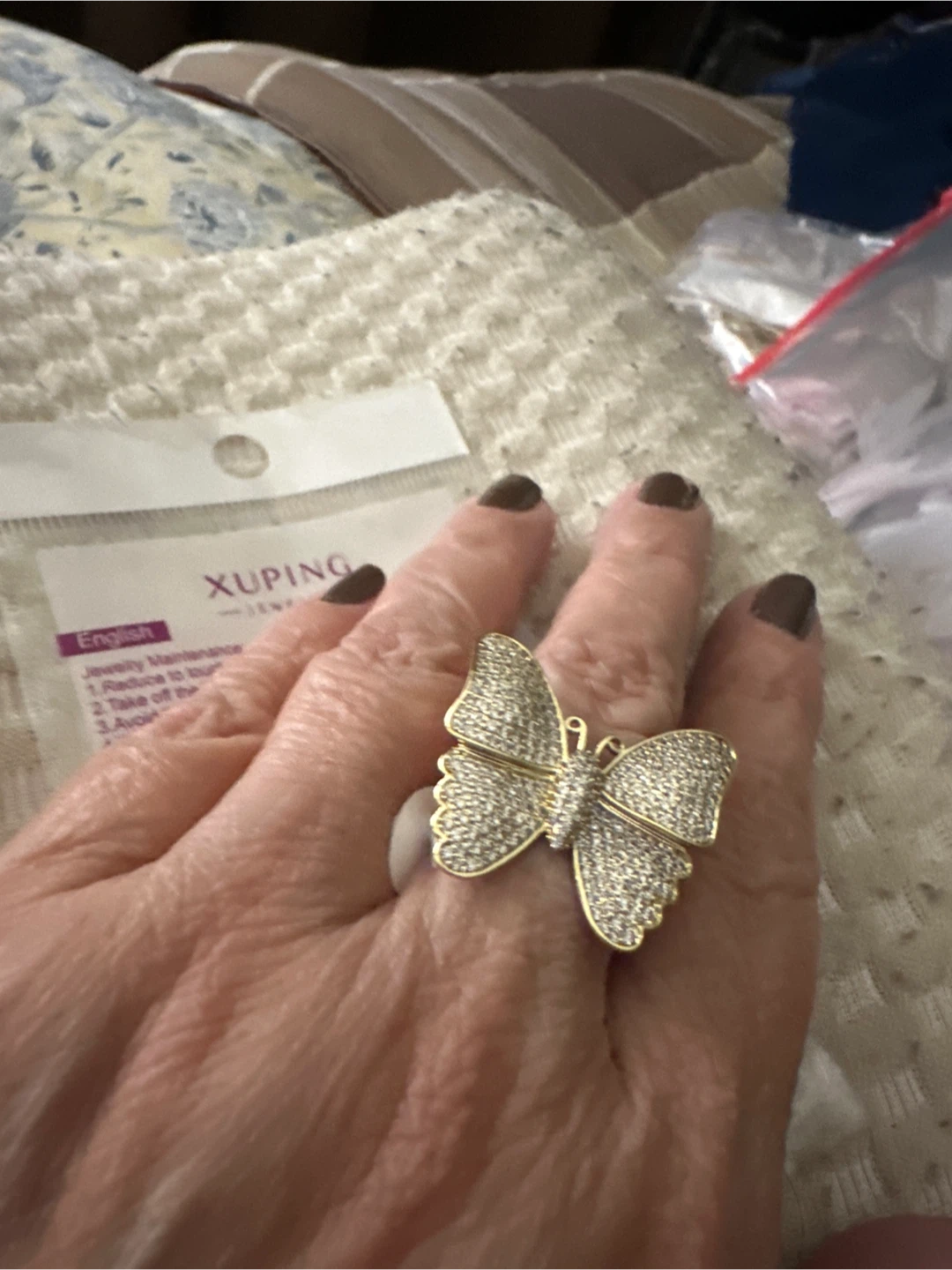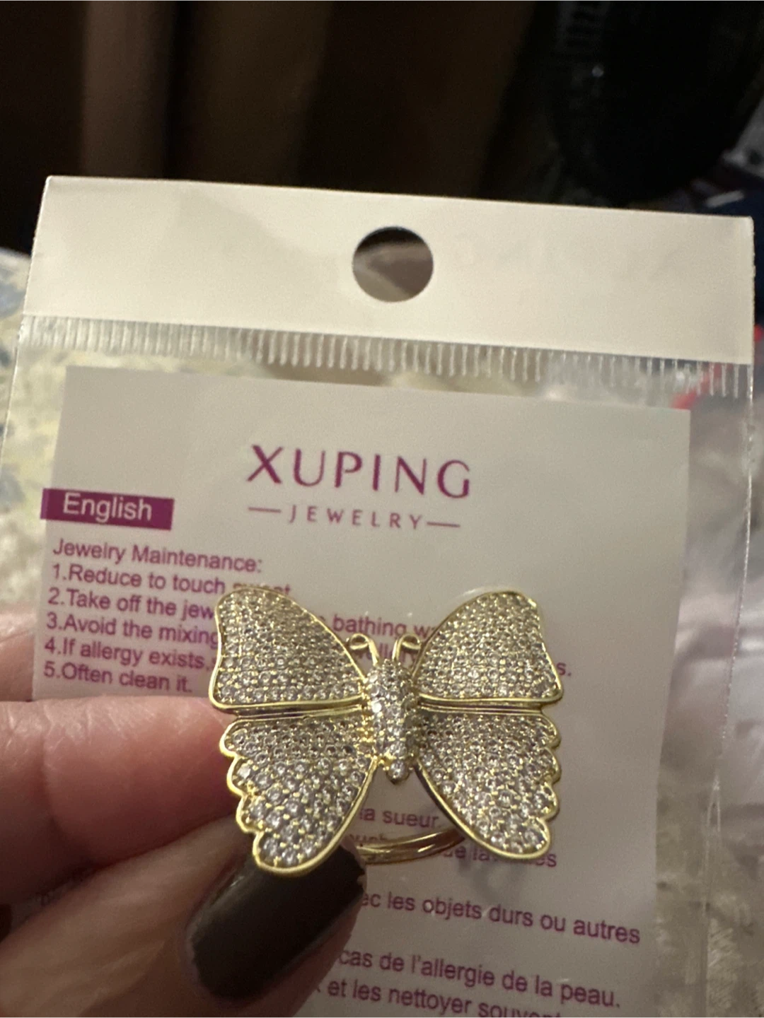 Xuping Jewelry butterfly ring. It's embellished with clear stones and set in a gold-tone metal. This ring offers a statement piece for any occasion!