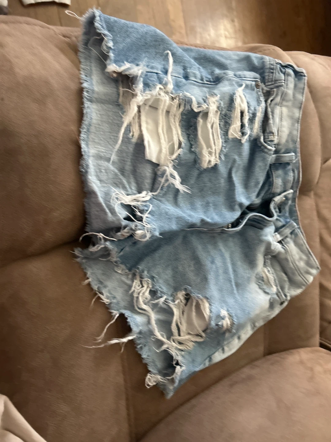 Light wash denim jean shorts with heavy distressing and raw hem. Frayed edges and ripped details throughout. Material is 100% cotton. Perfect for a casual summer look!