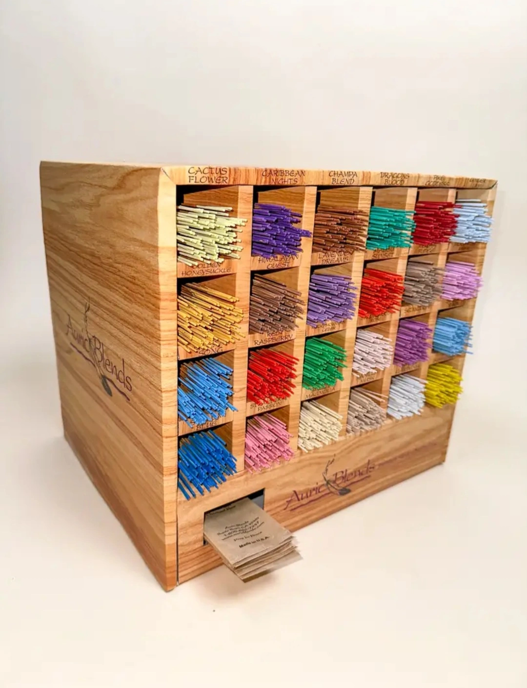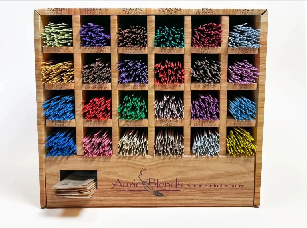 Auric Blends incense sticks. 36 different scents. AM BER APHRODESIA, ARABIAN MUSK, BLACK COCONUT, BLUE NILE, COCO MANGO, EGYPTIAN GODDESS, FRANKINCENSE & MYRRH, ISIS, ISLAND PARADISE, LOVE, MAJIK, NIGHT QUEEN, ONE LOVE, OPIUM, ORANGE SPICE, PATCHOULY, PEACH, RASTA, ROSE MUSK, SANDALWOOD, TRANSITION, TROPICAL RAIN, VANILLA, JASMINE, CLASSIC ROSE, LAVANDER, SAGE, LOVE ROSE Perfect for yoga meditation add a great fragrance to your home