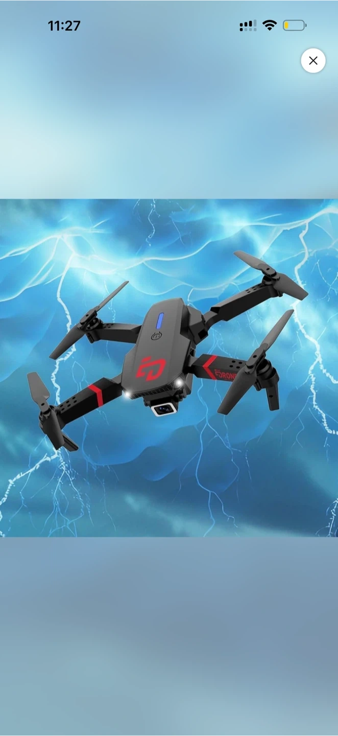 This quadcopter drone is black with red accents. It features a camera on the front and LED lights. It's a compact and foldable drone, perfect for aerial photography or recreational flying. Includes original box and accessories.