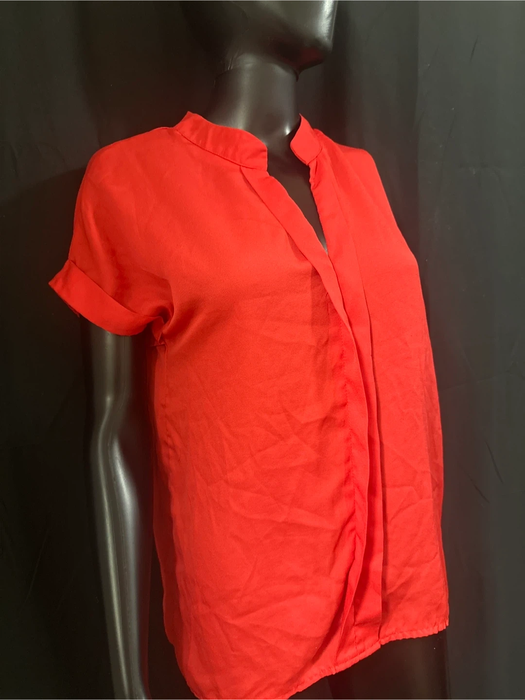 This is a women's short sleeve blouse in a vibrant orange color. It features a unique collar and a draped front. The material appears to be lightweight and breathable.
