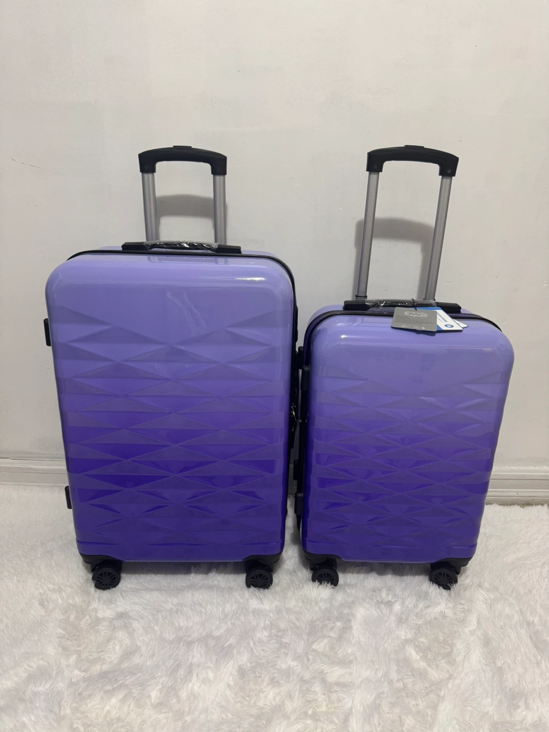 This is a set of two purple hardside spinner suitcases. They feature a unique textured diamond pattern and a gradient fade from light to dark purple. Each suitcase has an extendable handle and spinner wheels for easy maneuverability. These are great for travelers who need different sizes for various trips!size:24”20”