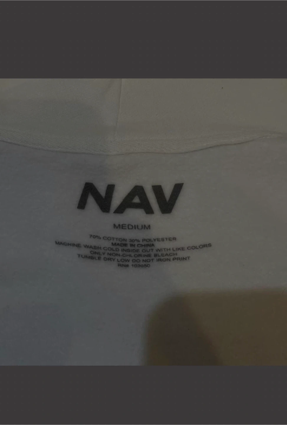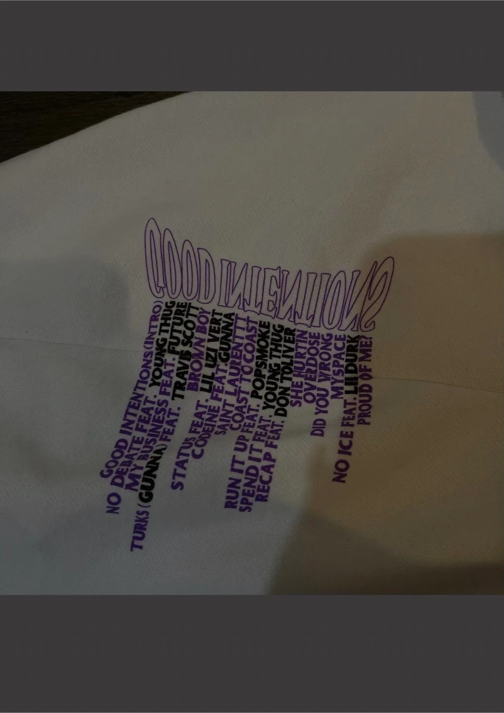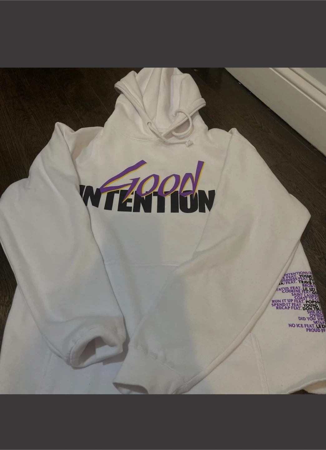 White VLONE hoodie featuring the 'Good Intentions' graphic on the front and a large 'V' with doves on the back. Made with a 70% cotton and 30% polyester blend. Machine wash cold inside out with like colors. Tumble dry low, do not iron print.