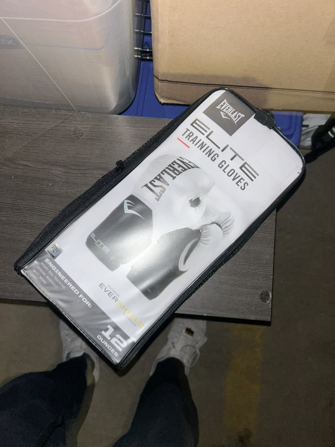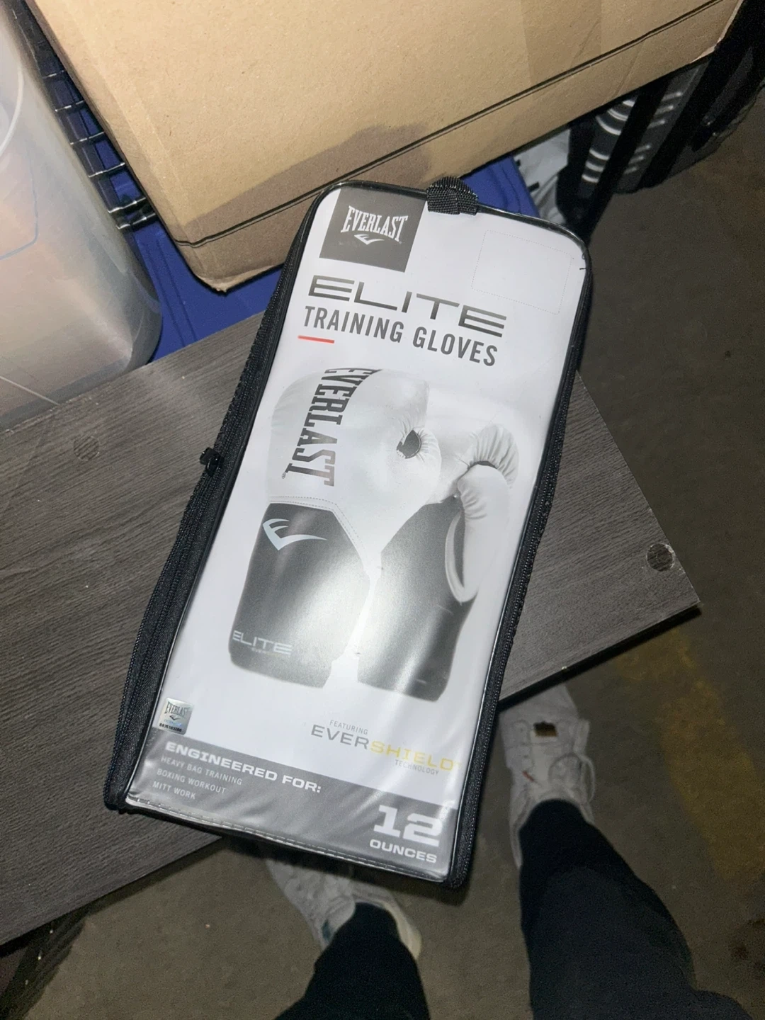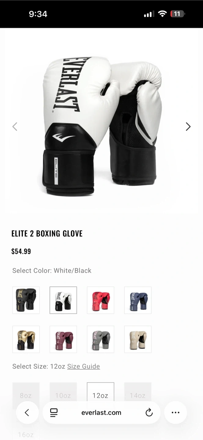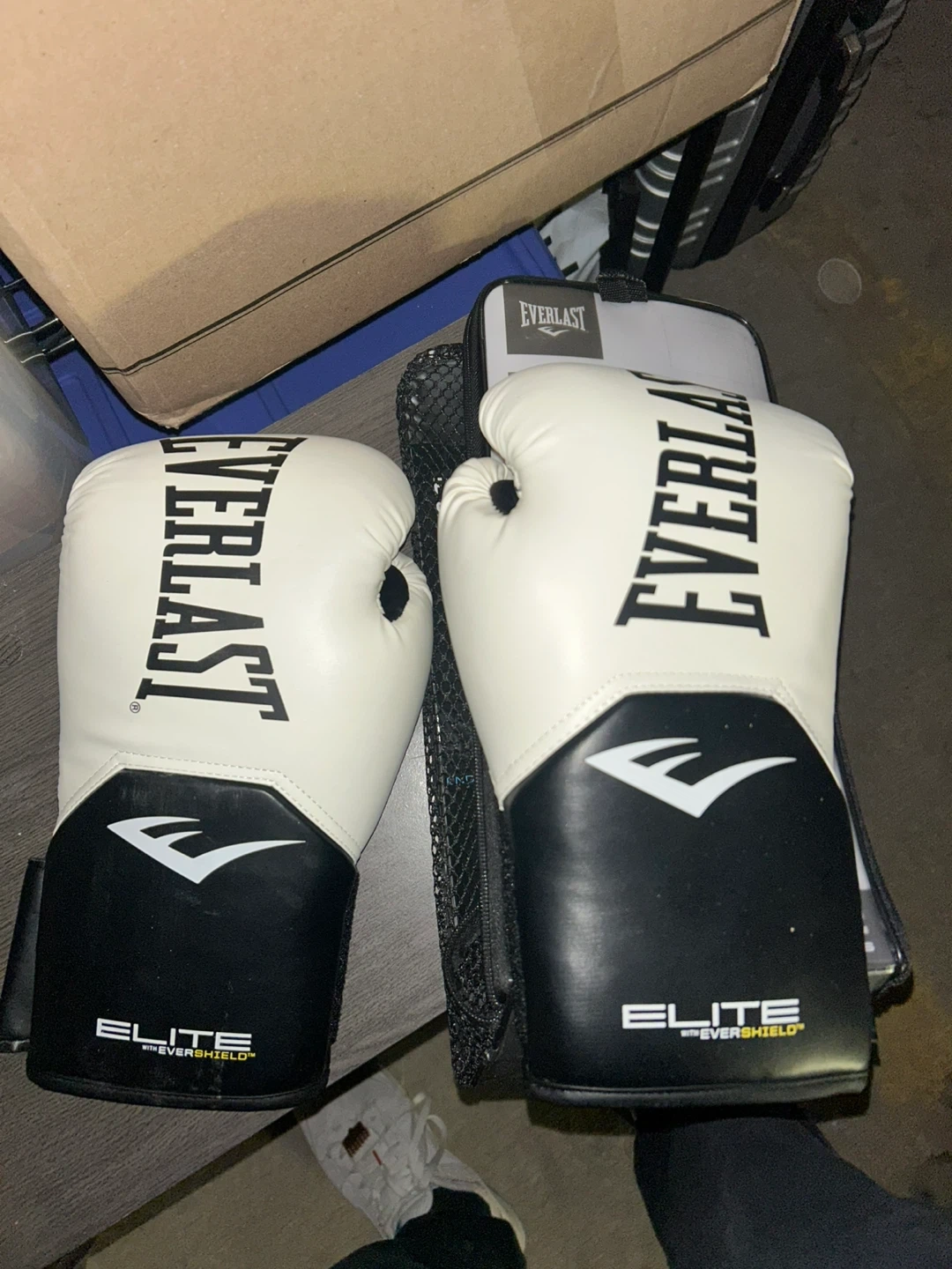 Everlast Elite 2 training gloves in white and black. These are a size 12oz. They're designed for bag training, boxing workouts, and mitt work. Includes a zippered carrying case.