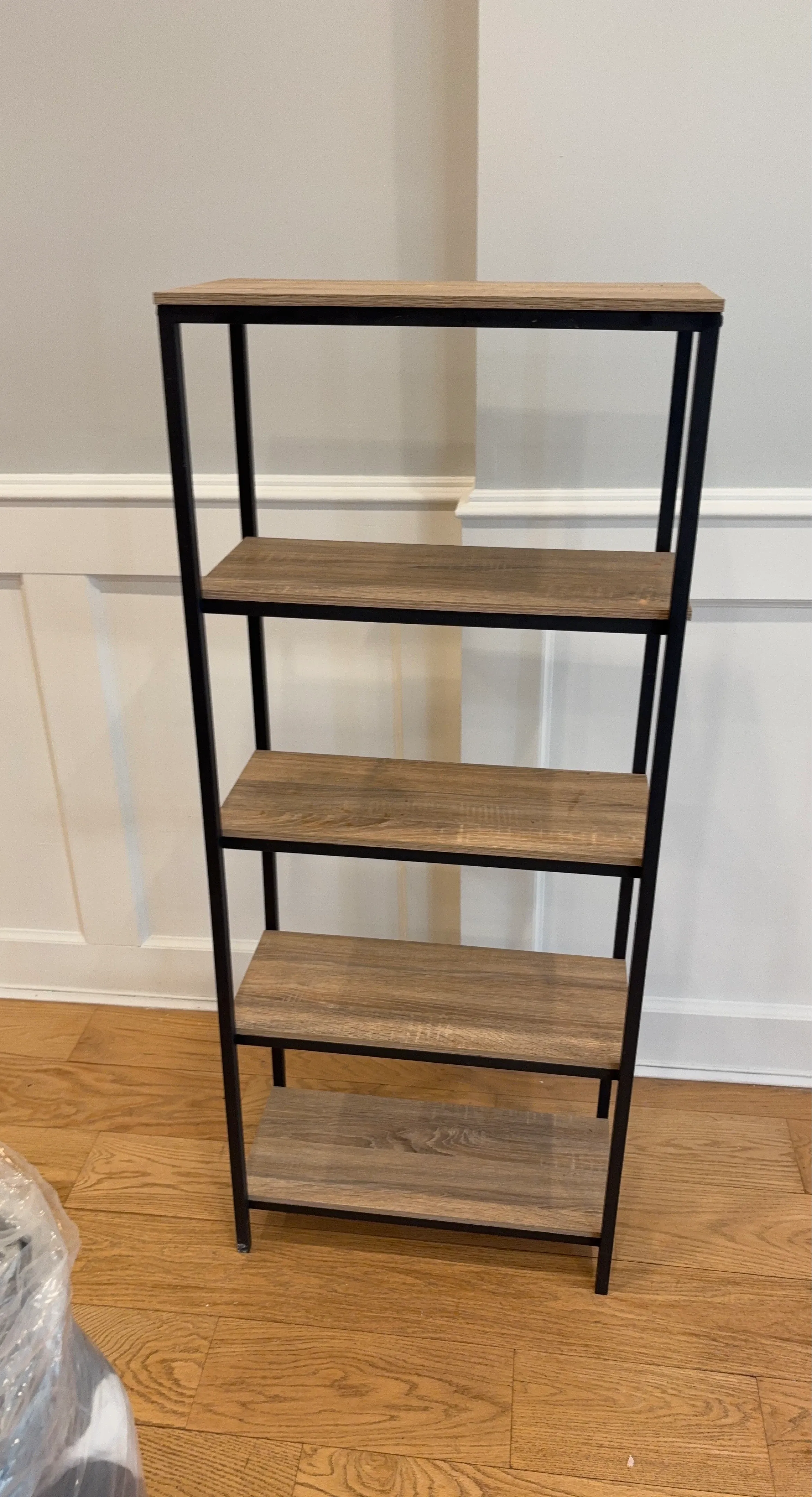 This ladder shelf features a rustic wood grain finish with a black metal frame. It's perfect for displaying books, plants, or decorative items. The open back design adds to its modern aesthetic. Offers ample storage with four spacious shelves.