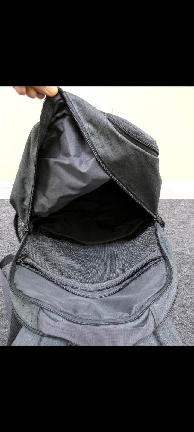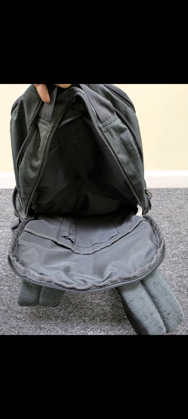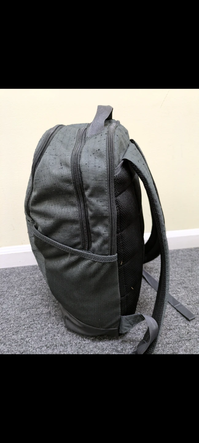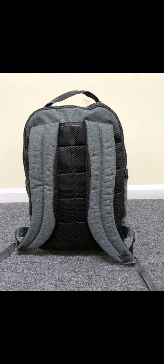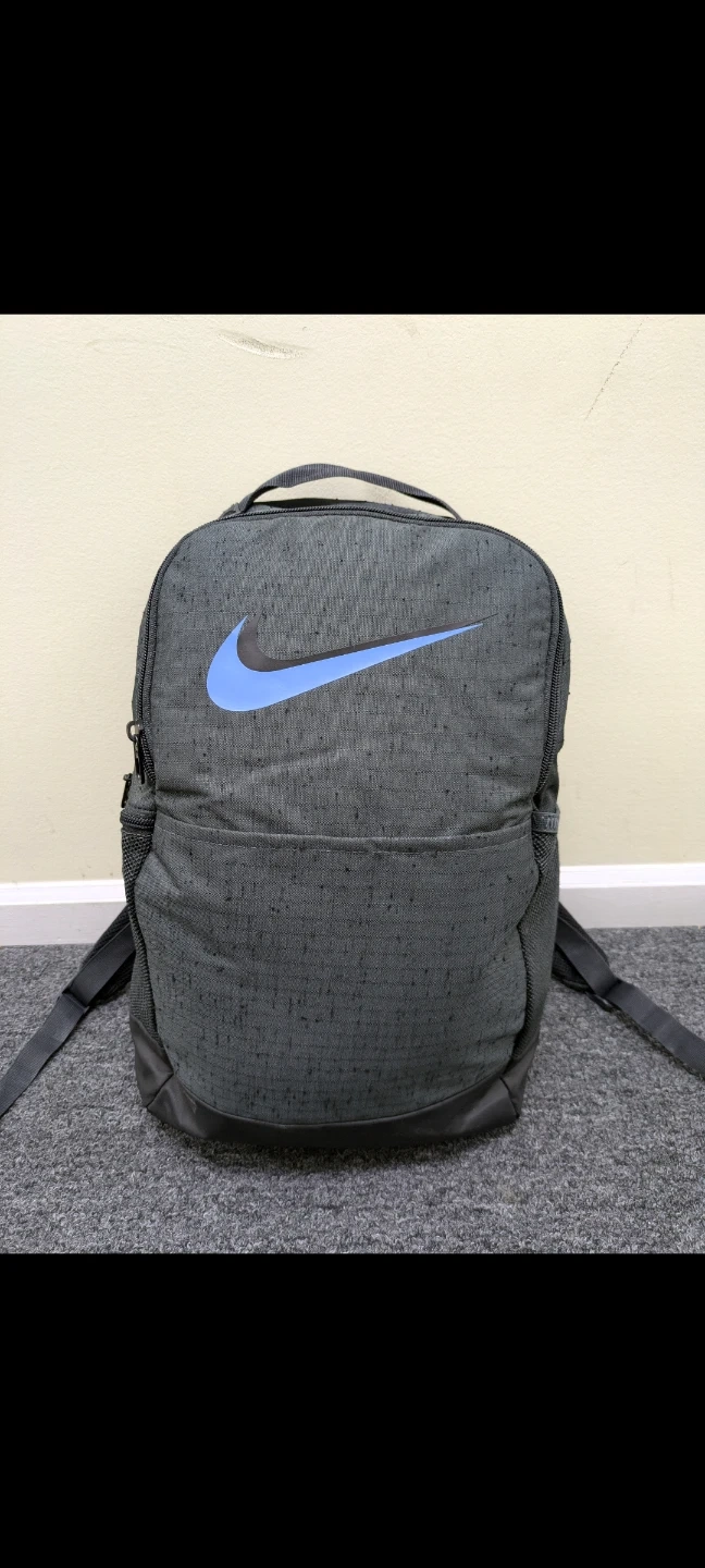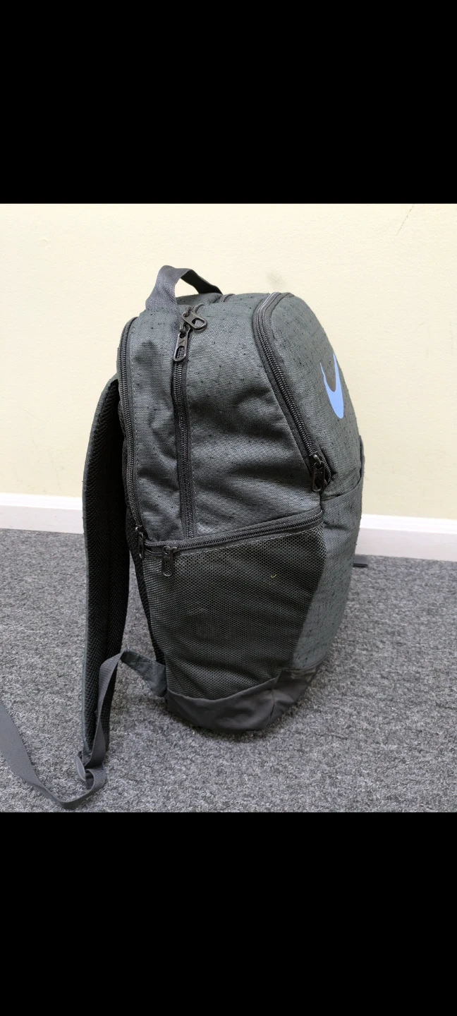 This is a gray Nike backpack with a large main compartment and a front zip pocket. It features padded shoulder straps and a durable material. It's great for everyday use or sports activities!