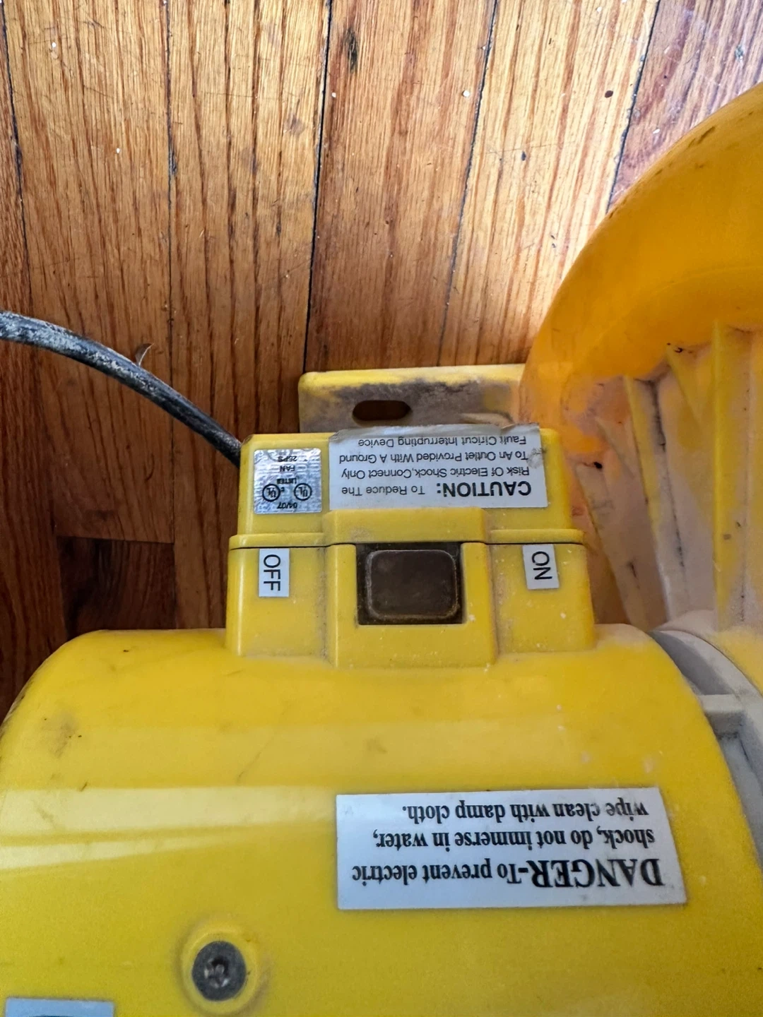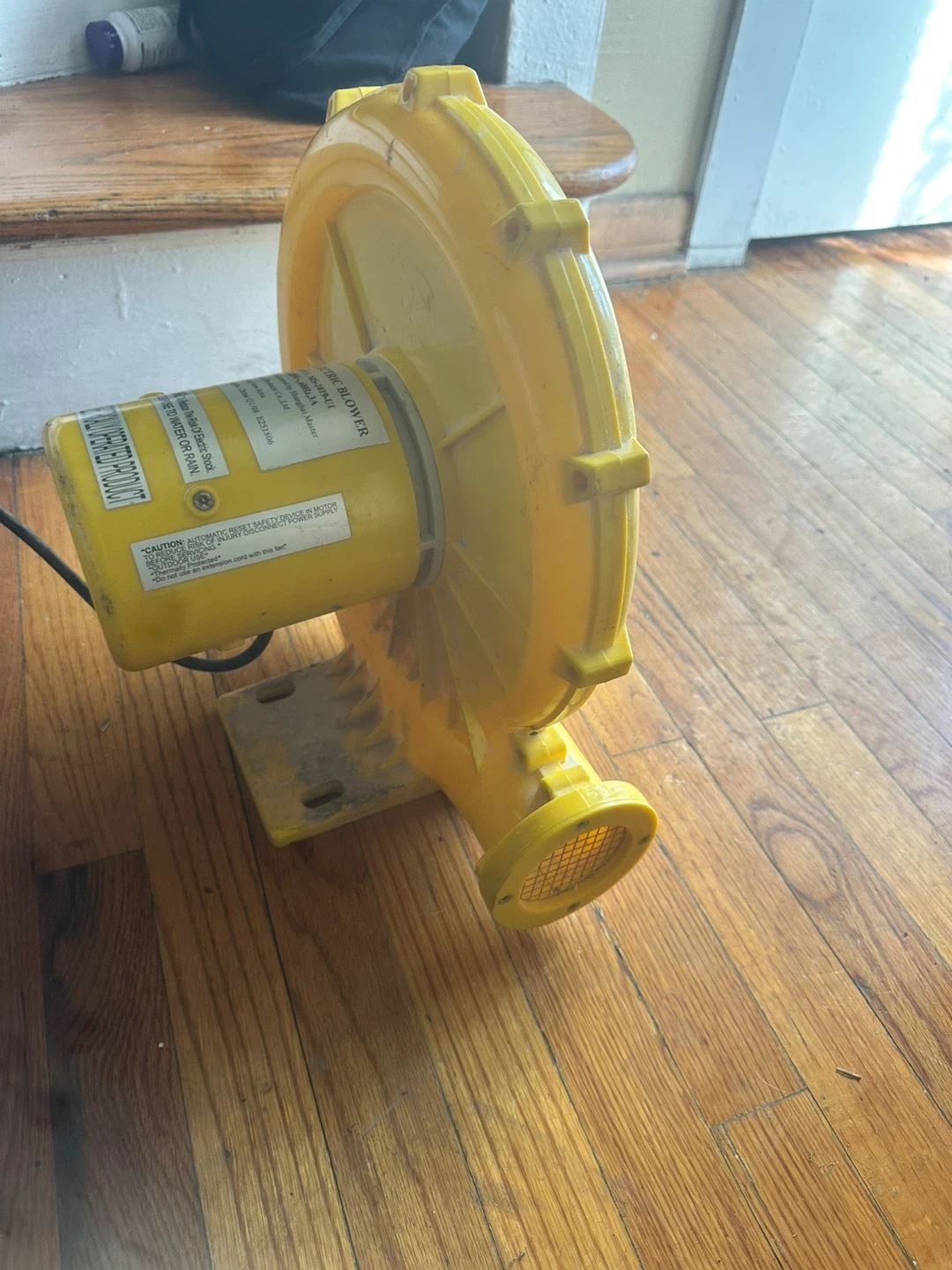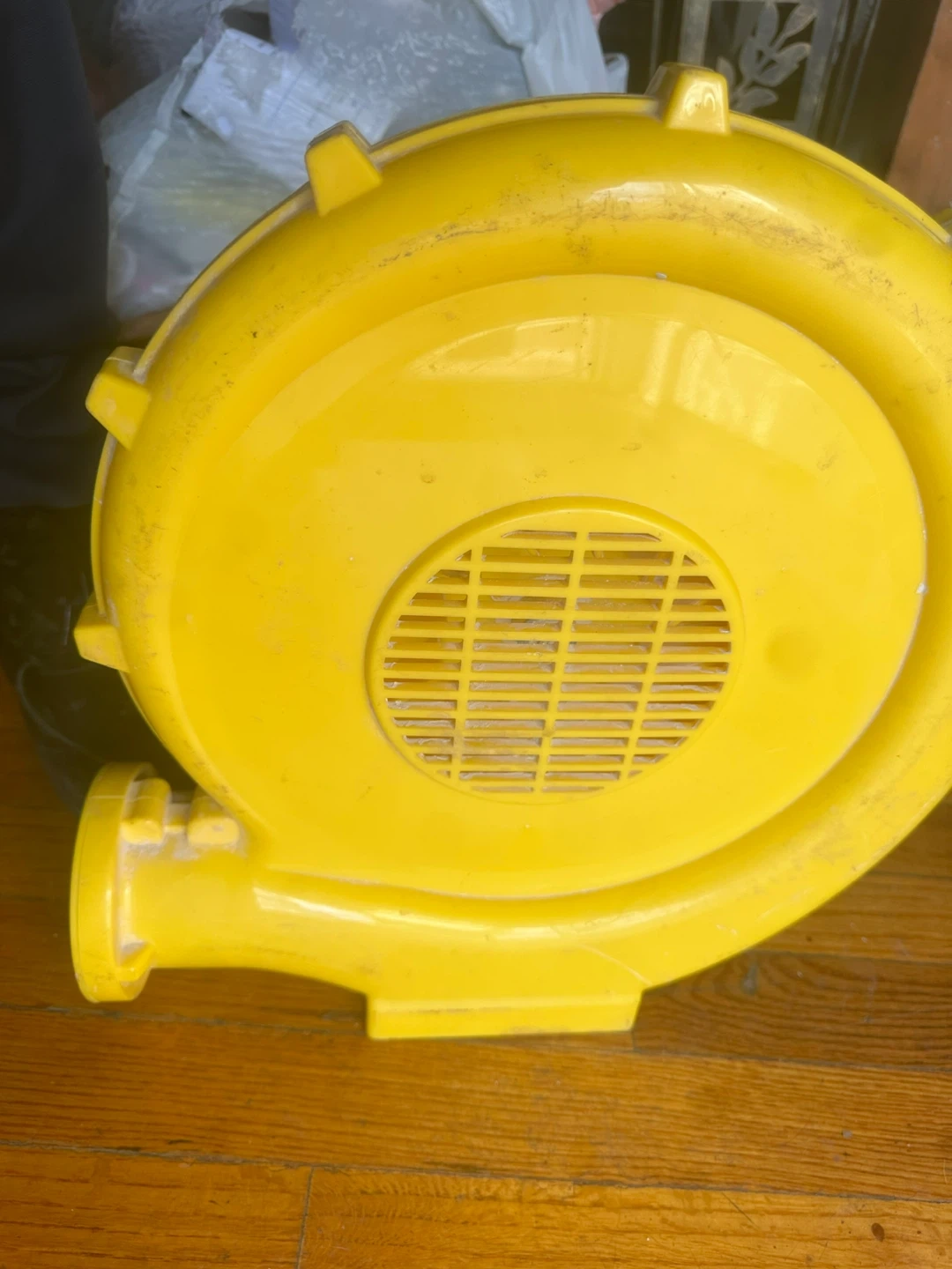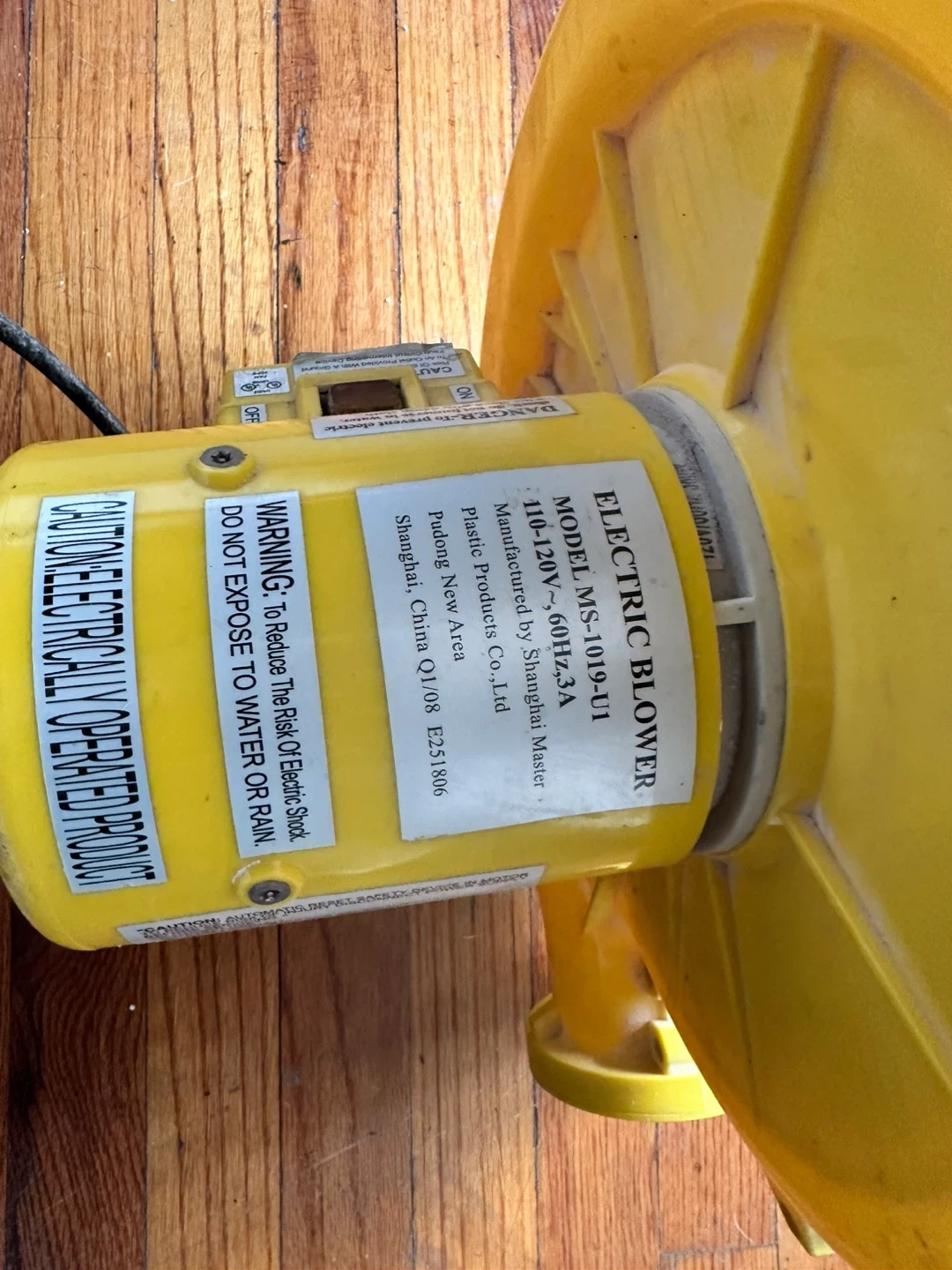 This is a yellow electric blower, model MS-1019-U1. It operates on 110-120V, 60Hz, 3A. Manufactured by Shanghai Master Plastic Products Co., Ltd. It's suitable for inflating bounce houses or other inflatable structures.