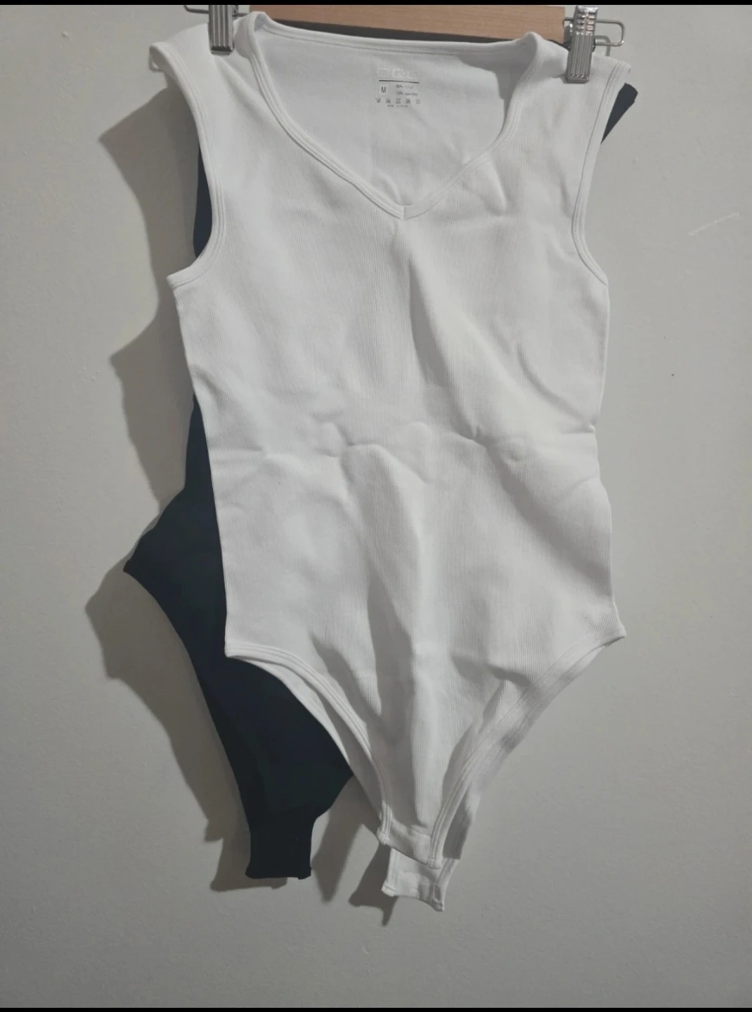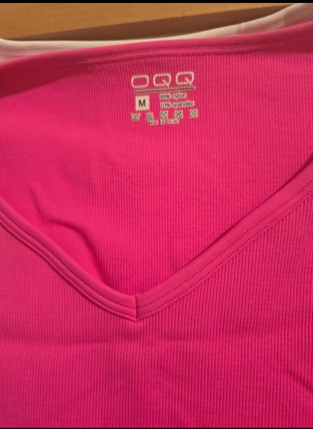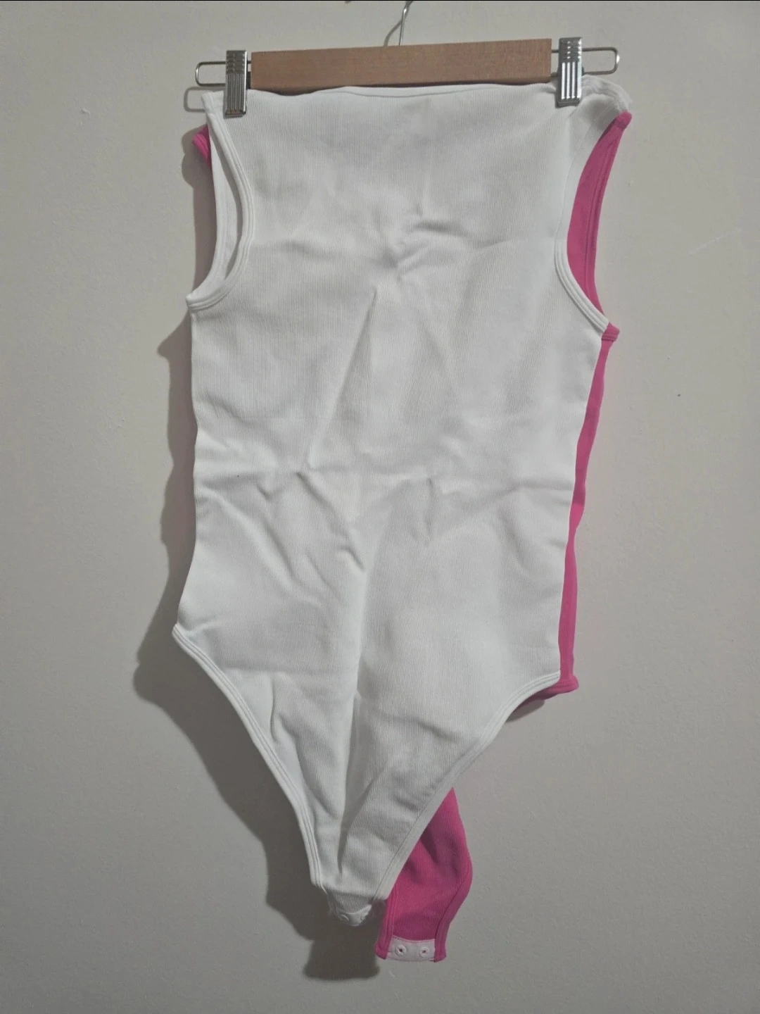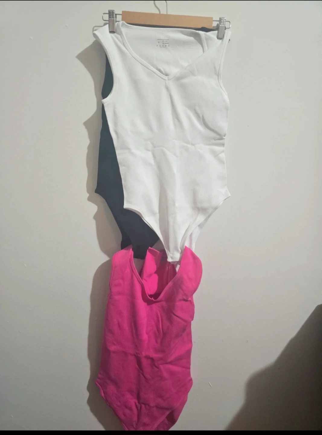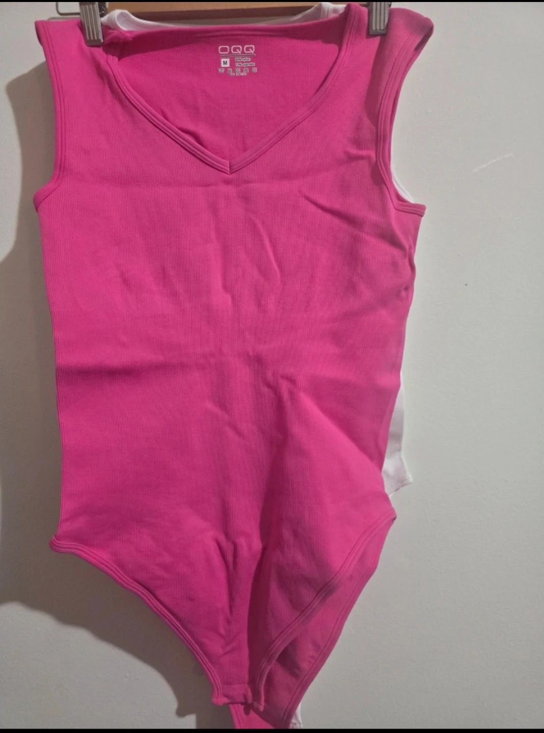 Set of 3 viral bodysuits from the brand OQQ, brand new in package. This is a size Medium (M) and includes three colors: Hot Pink, White, and Black. The style is ribbed, sleeveless, with a v-neck. They are very comfortable and known for being figure-flattering. Condition: New in Package (NIP).