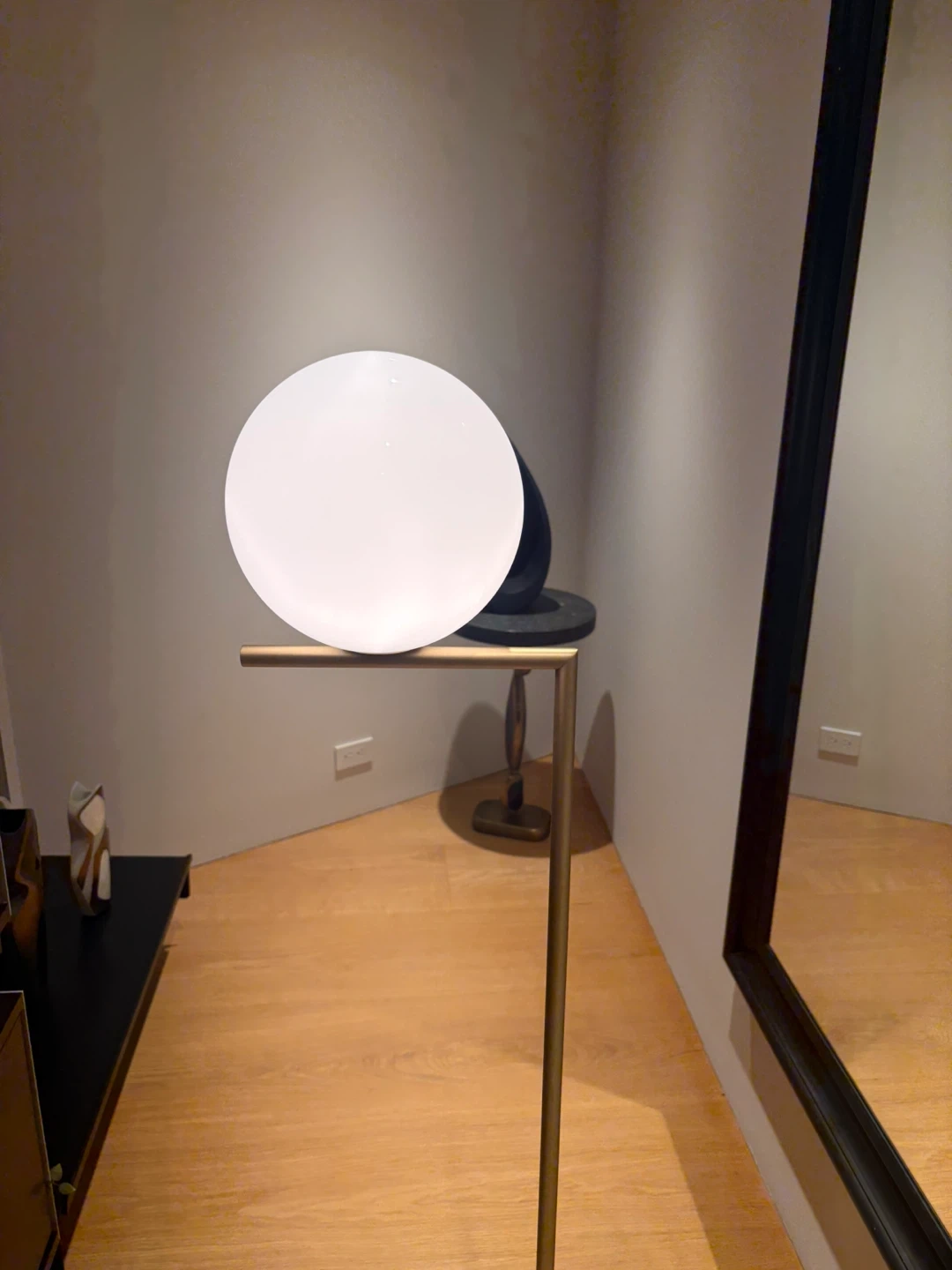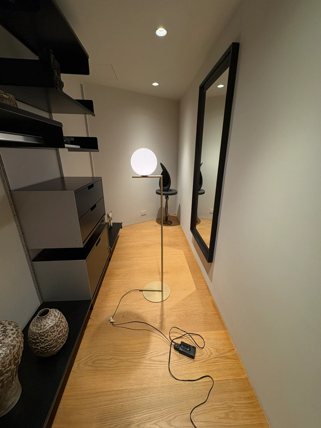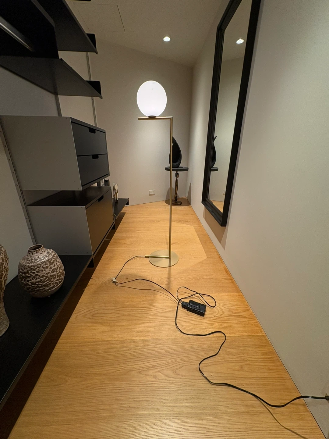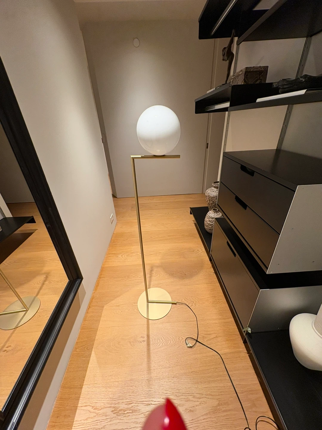 60Selling a beautiful IC Lights F floor lamp by Flos. This elegant lamp features a spherical white diffuser and a sleek brass frame. It adds a touch of modern sophistication to any room! Perfect for creating a warm and inviting atmosphere