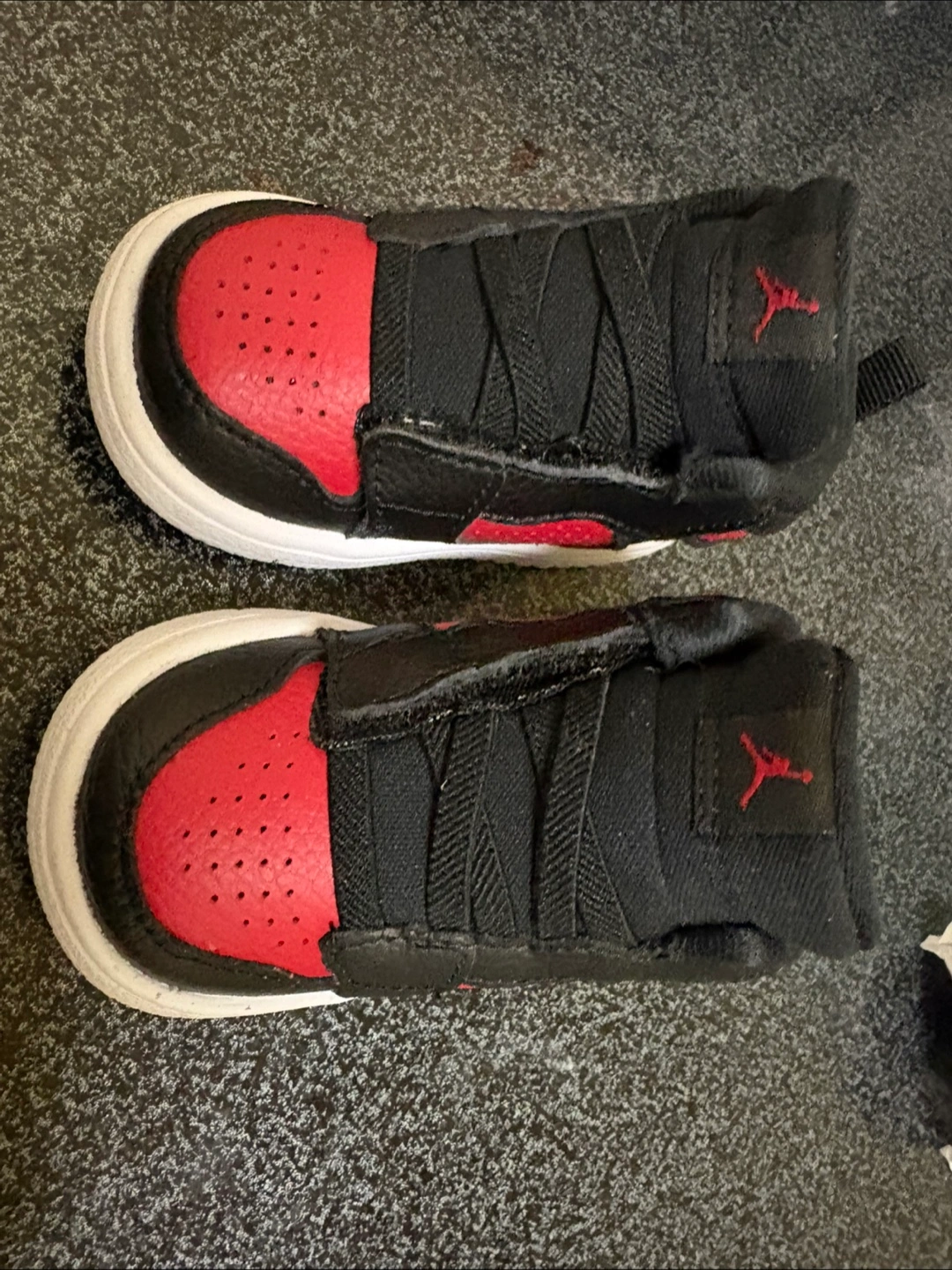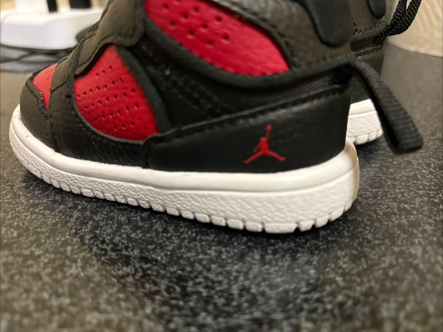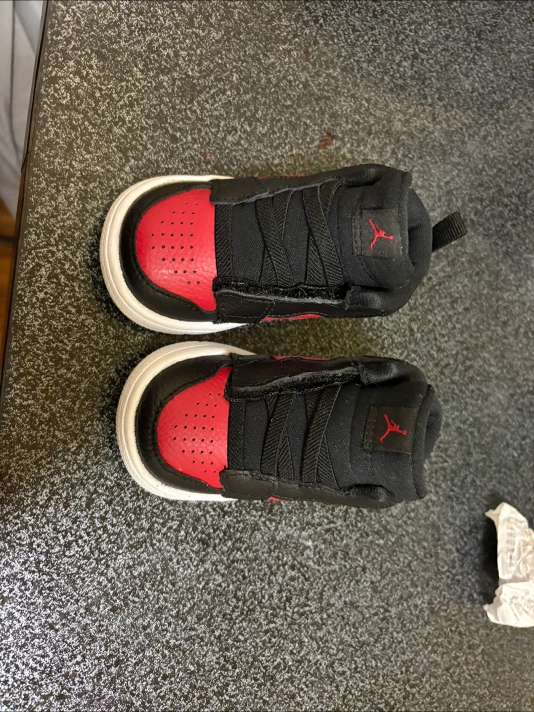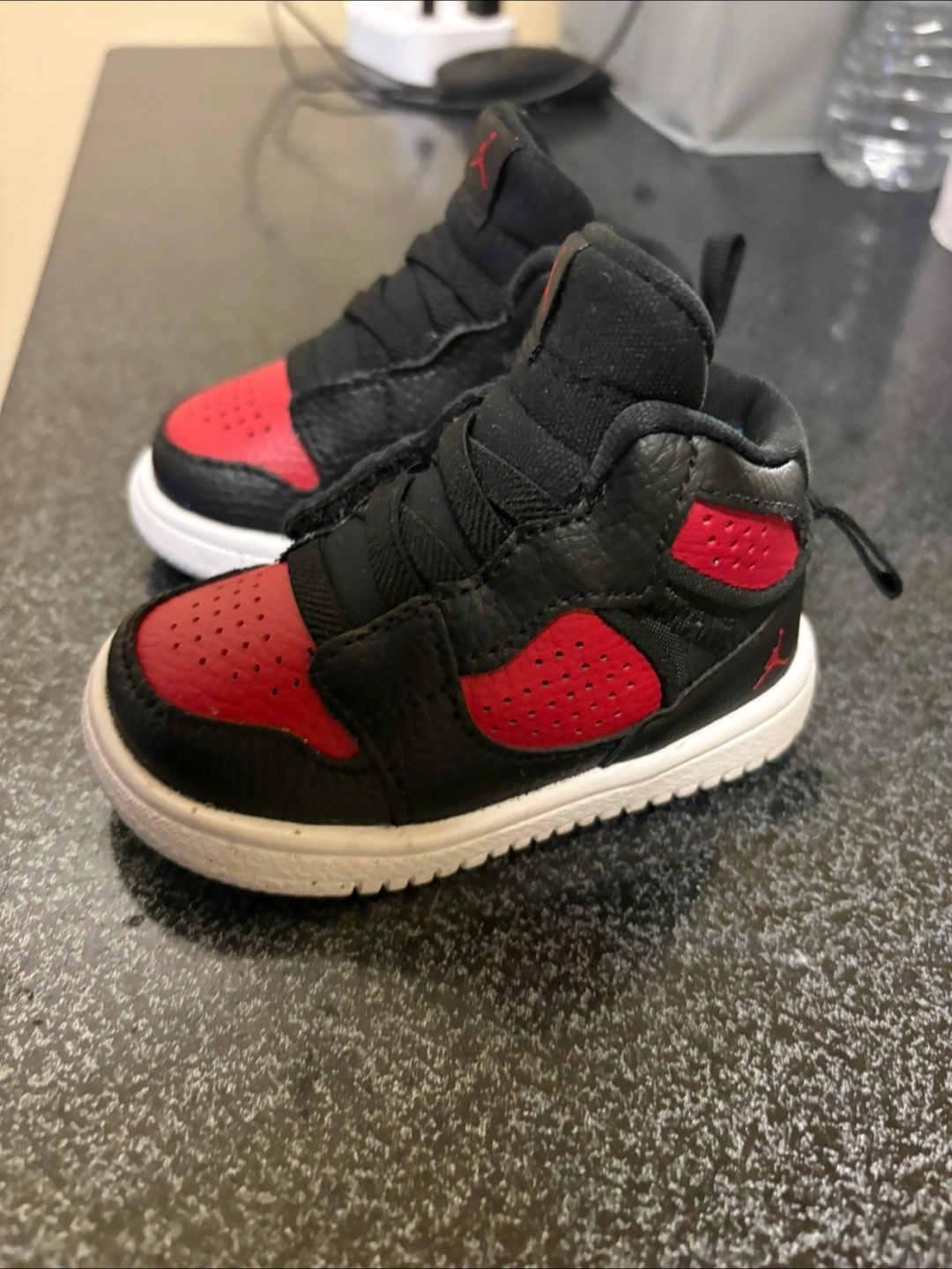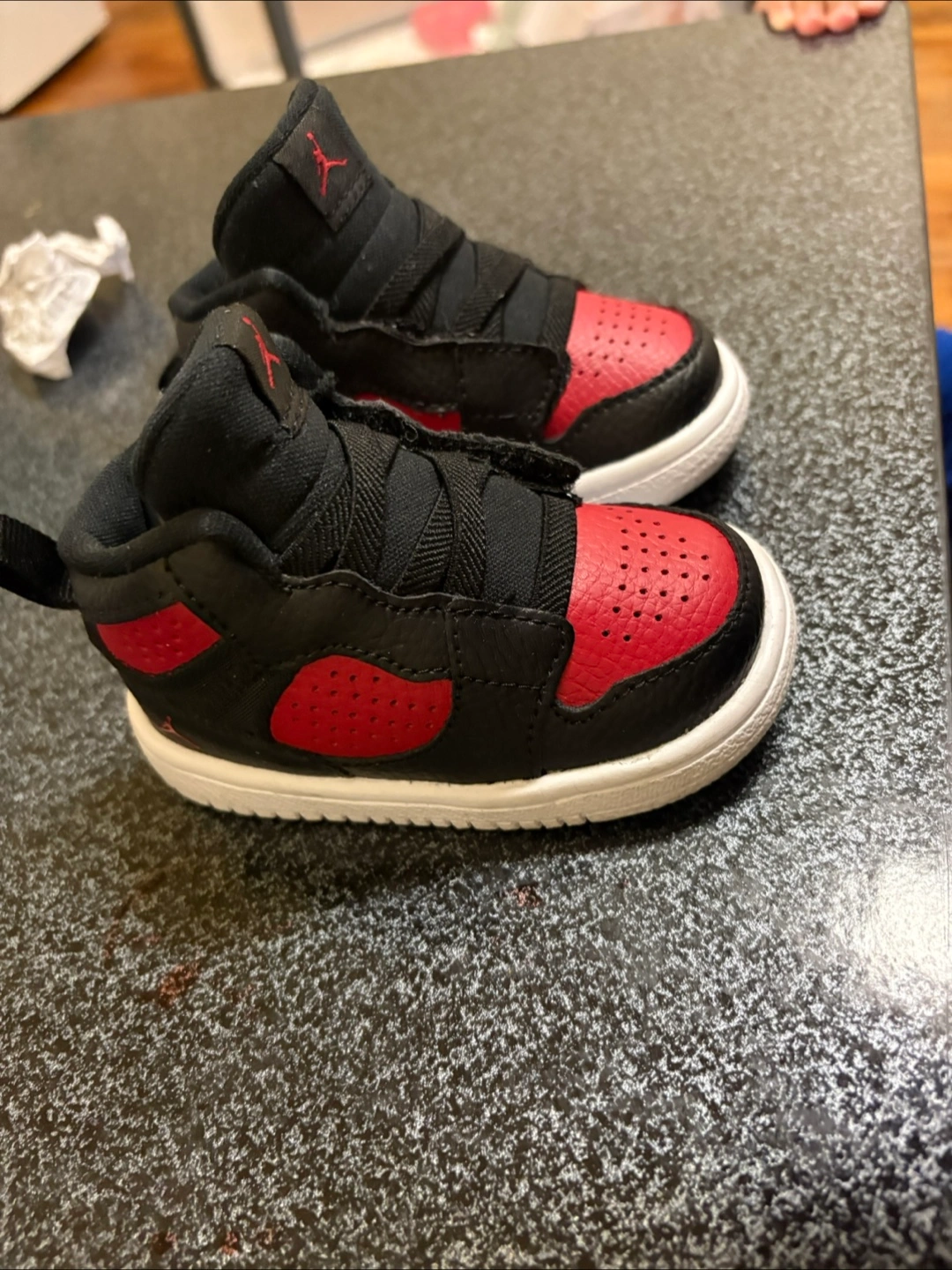Black and red infant high top sneakers. White soles, a classic design. Perfect for little feet, ensuring comfort while strolling.