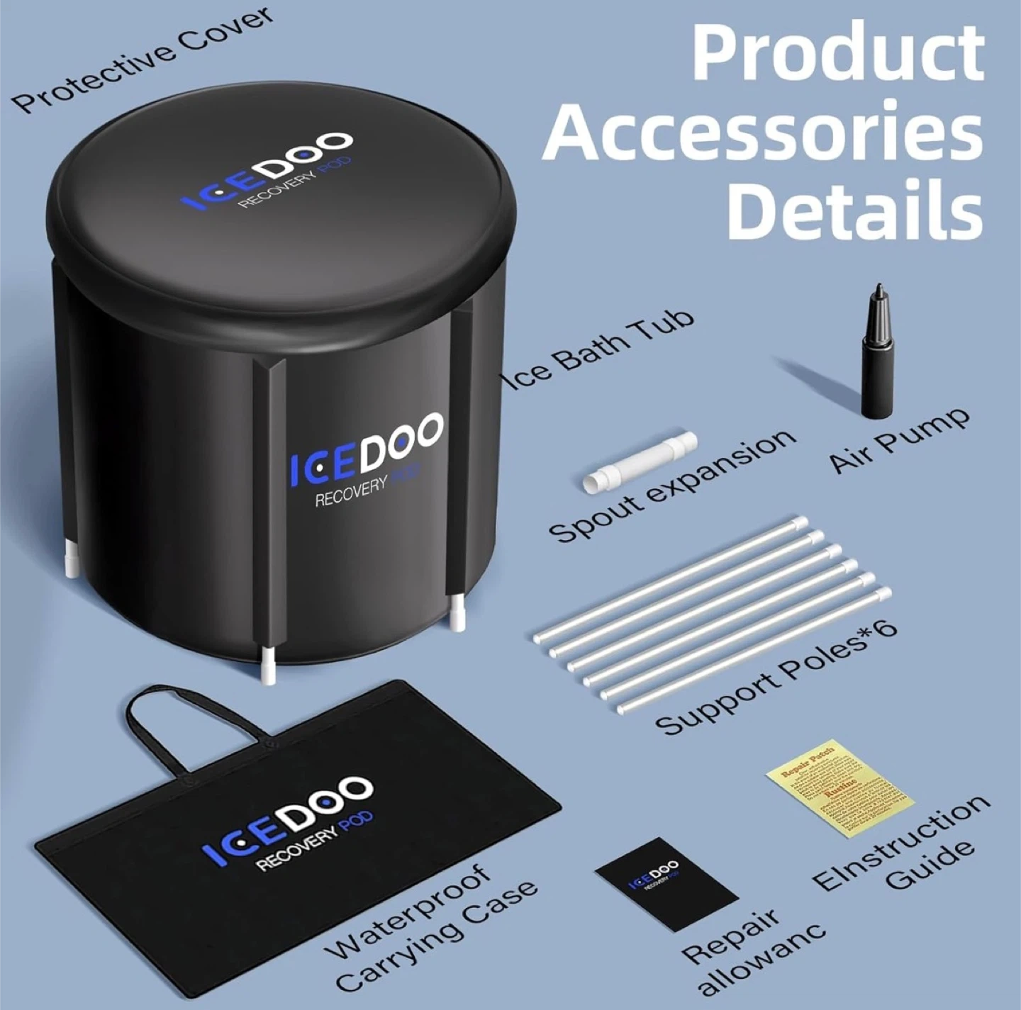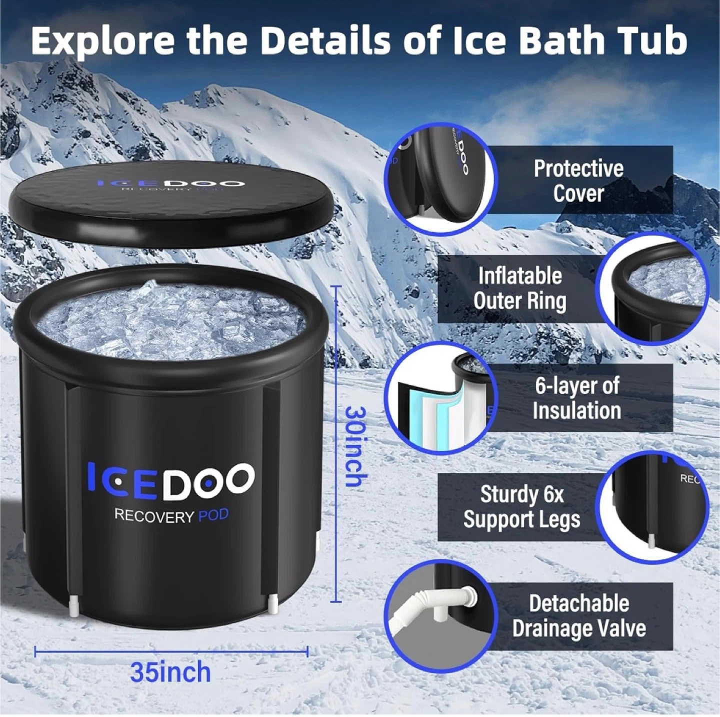 Get ready to recover like a pro with this IceDoo Recovery Pod ice bath tub! It's in like-new condition and ready for its next owner. Key features include: - Inflatable outer ring - 6-layer insulation - Sturdy 6x support legs - Detachable drainage valve It also comes with a protective cover, air pump, spout expansion, support poles, waterproof carrying case, repair allowance, and instruction guide In original packaging – straight from Amazon!!