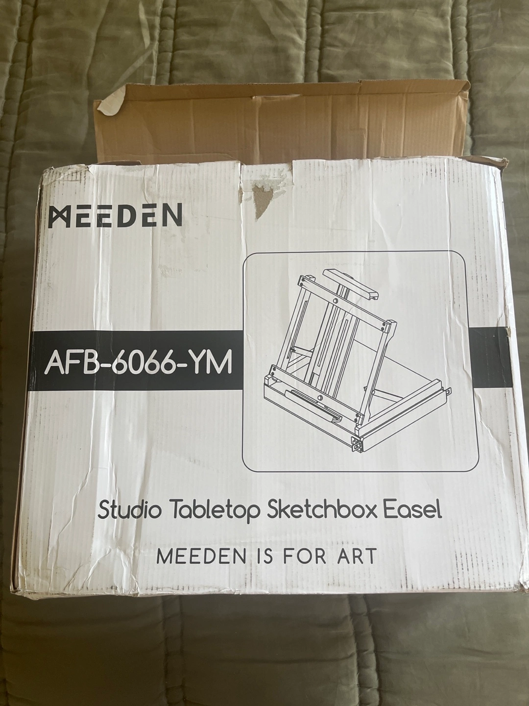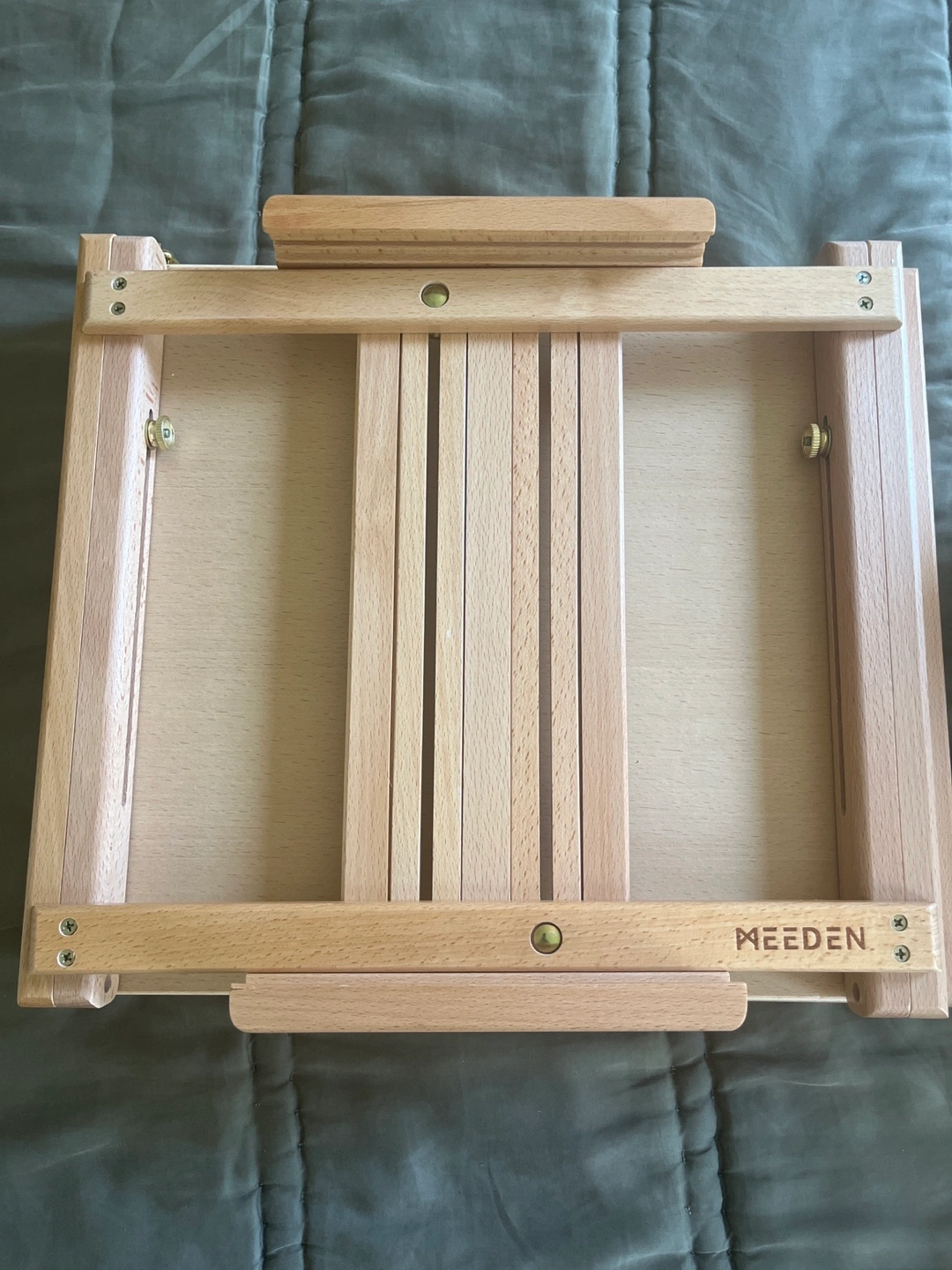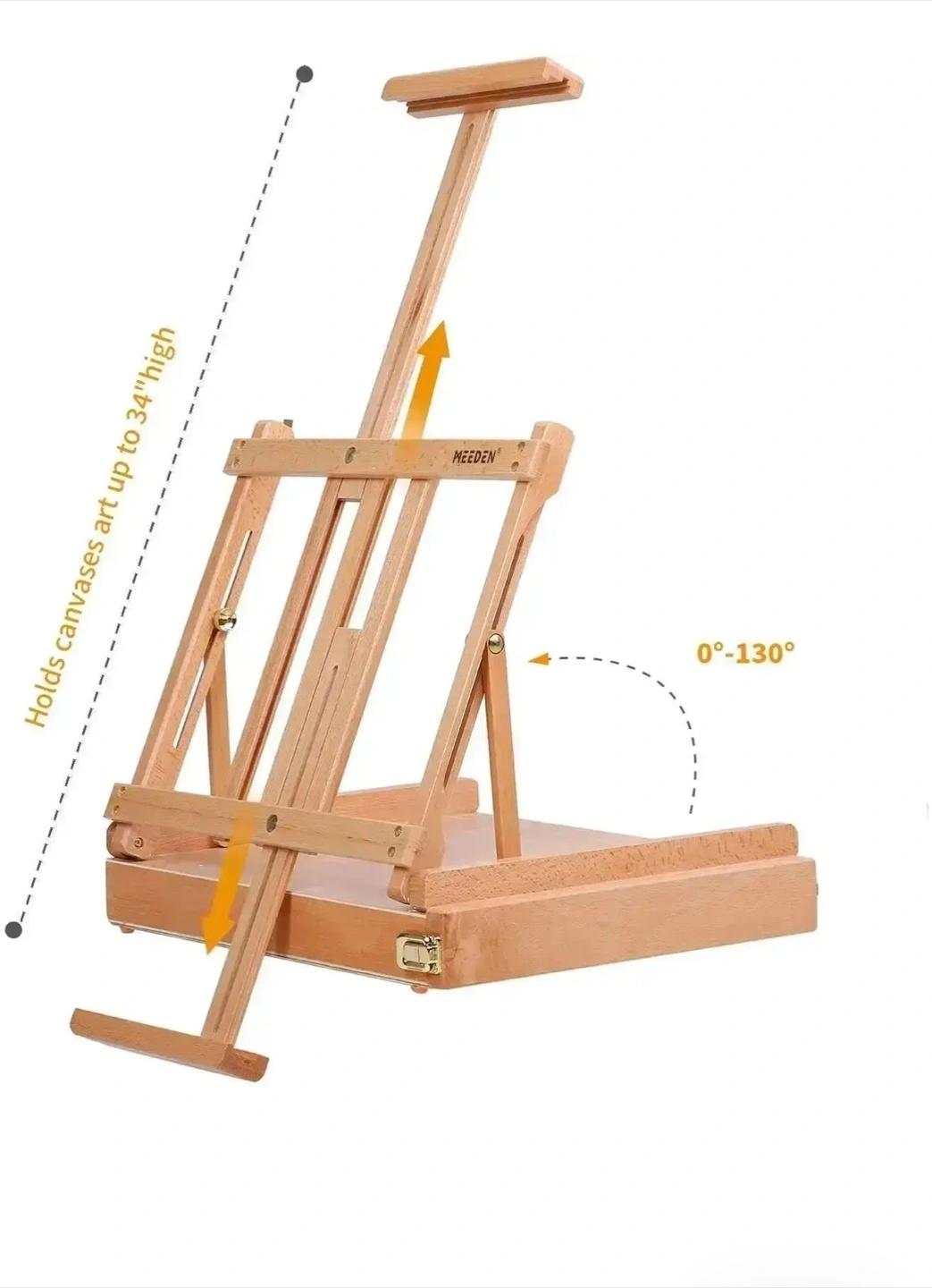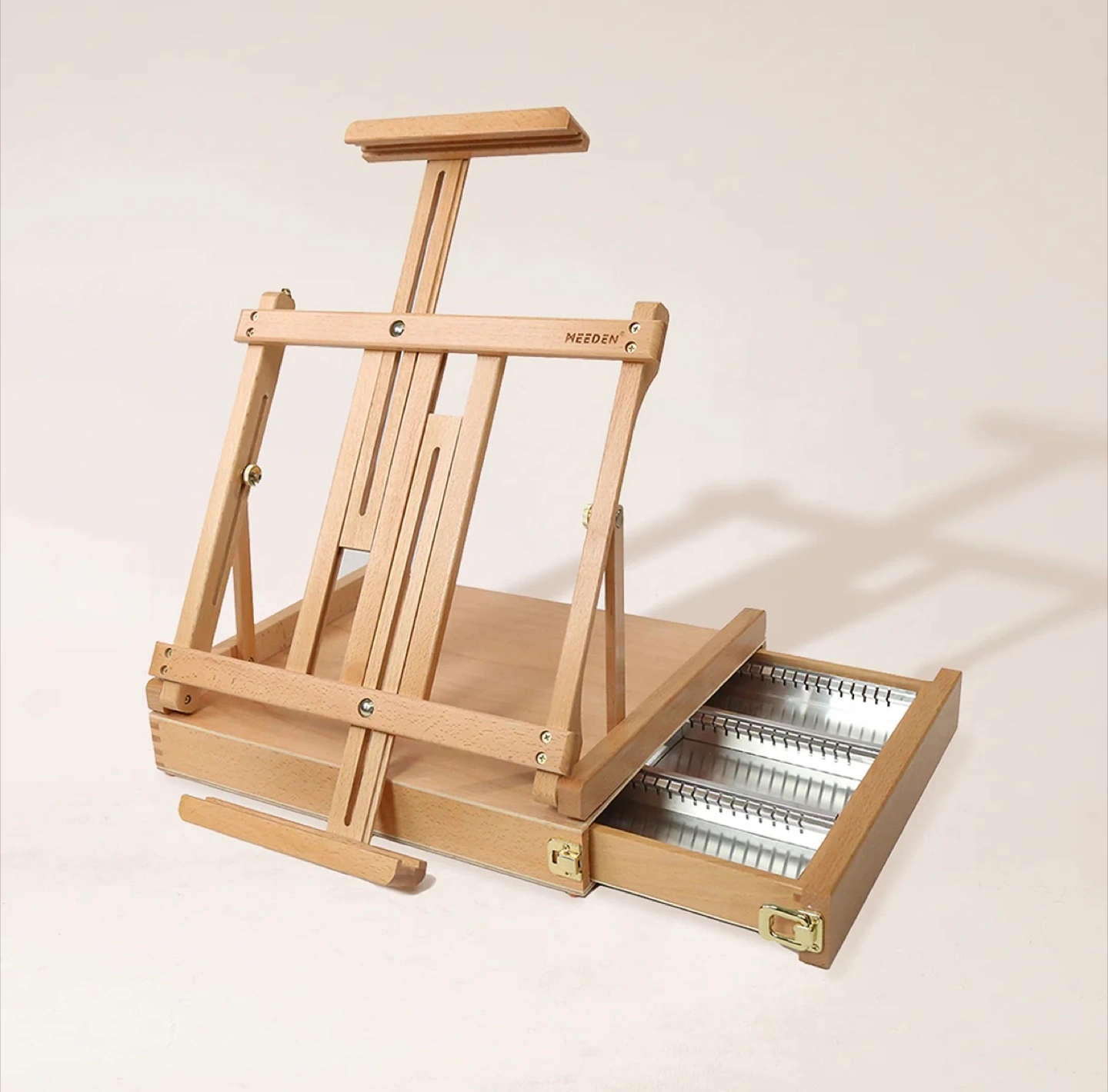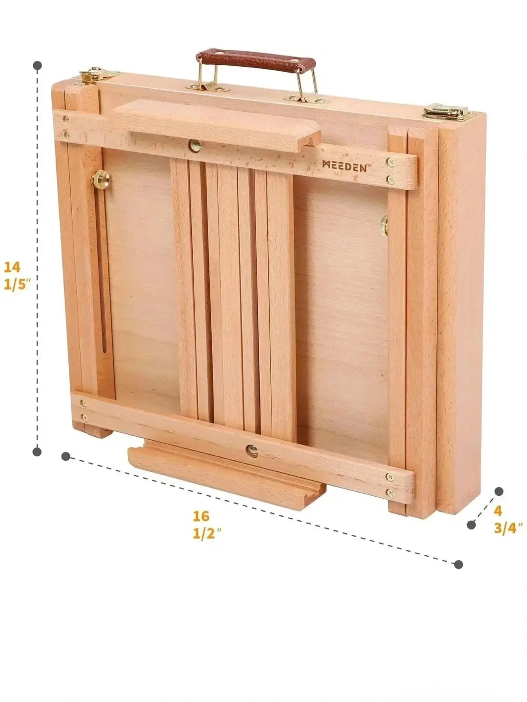 Selling a MEEDEN studio tabletop sketchbox easel. Box included. Handmade premium, sanded solid European Beechwood with brass plated hardware and a leather carrying handle. Converts into a travel case for painting on the go.