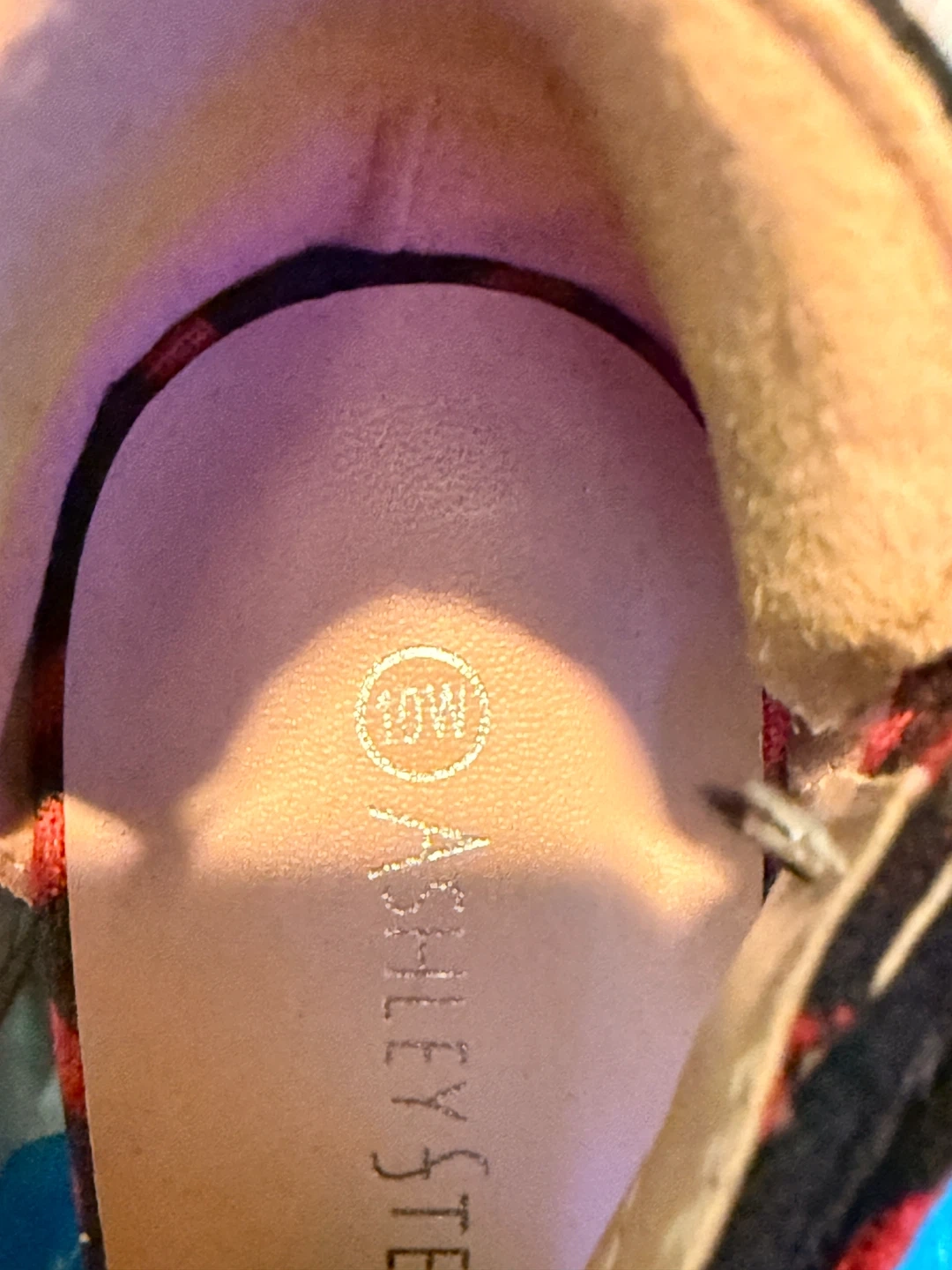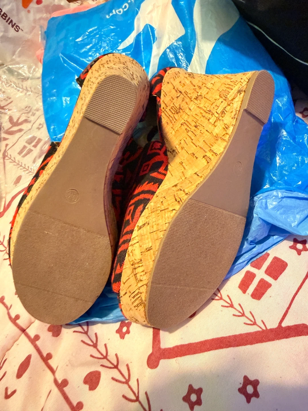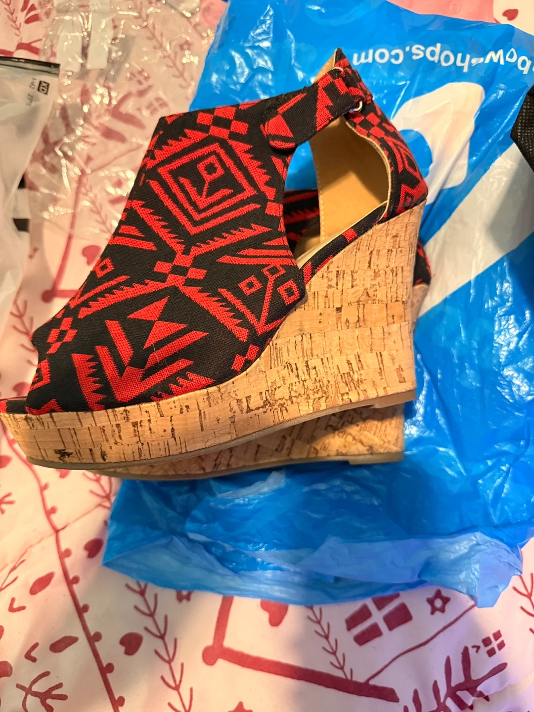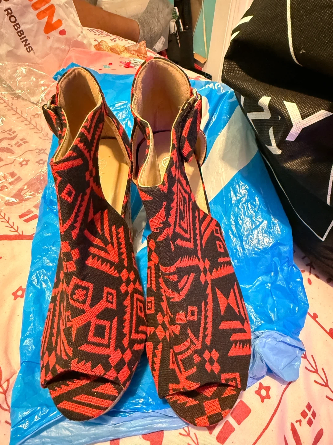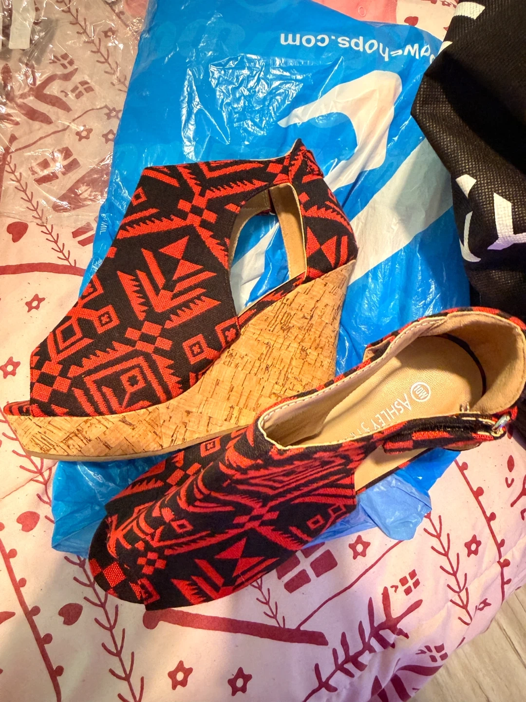 Stylish wedge sandals with a black and red geometric pattern. Features a peep toe and cork-style wedge heel. Size is 10W. Perfect for adding a pop of color to any outfit!