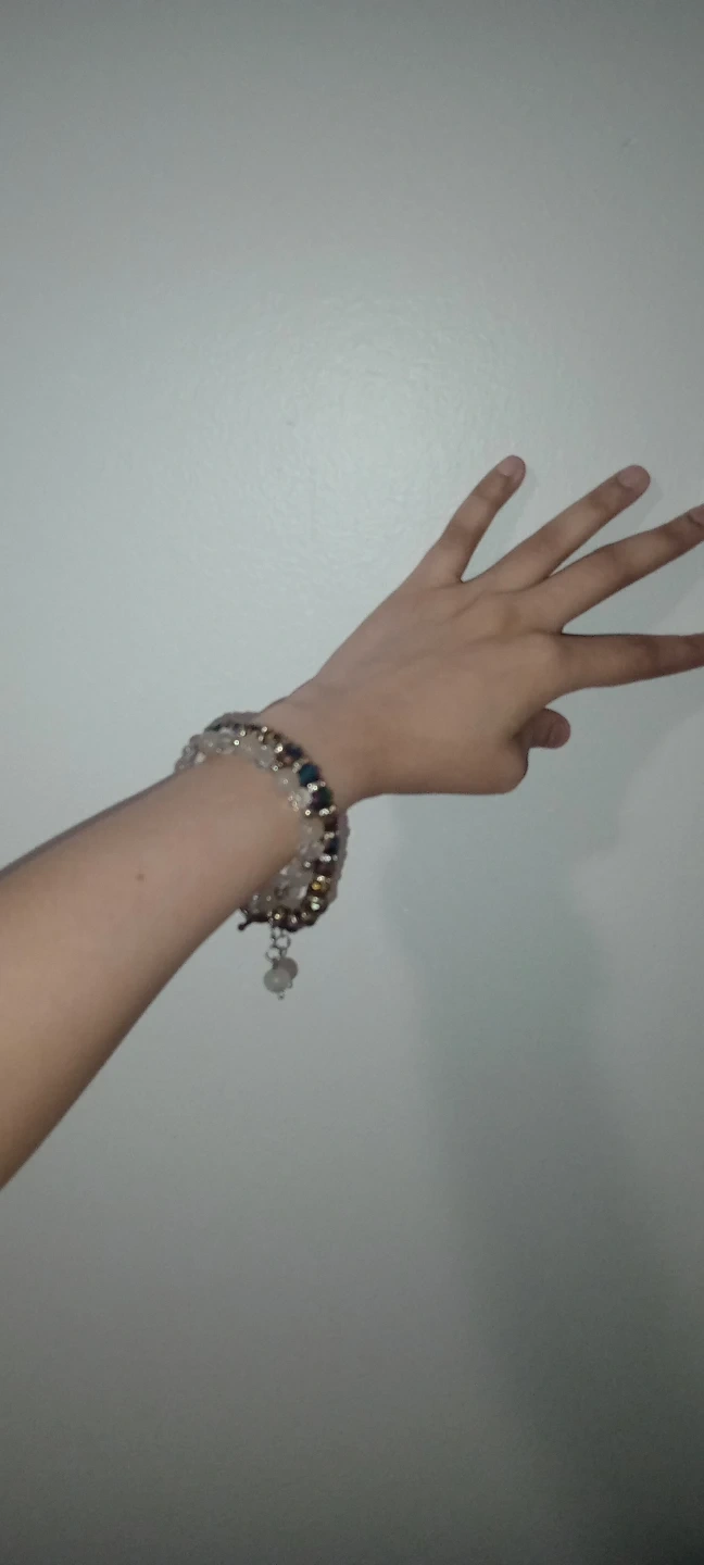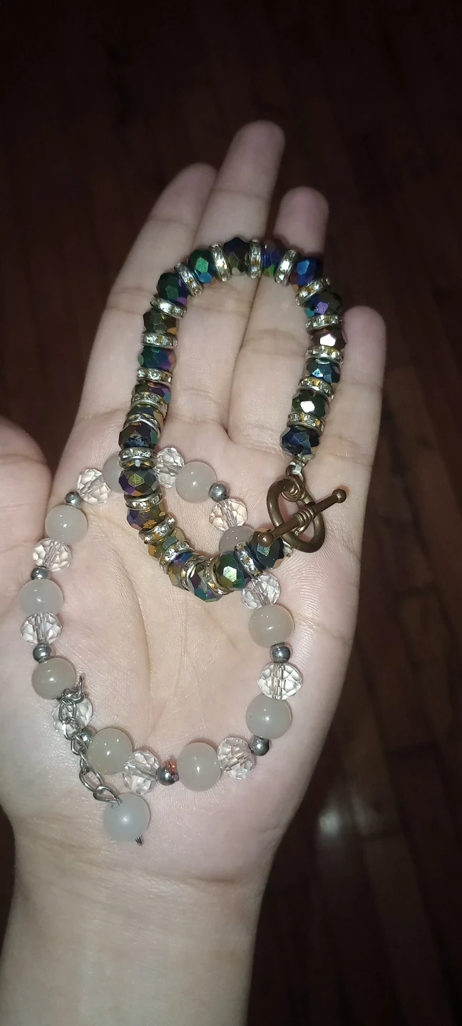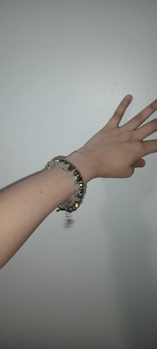 This bracelet features a mix of clear, iridescent, and possibly rose quartz beads. It has a toggle clasp closure and a small dangling charm. It's a statement piece! It's suitable for adding a touch of sparkle to any outfit.