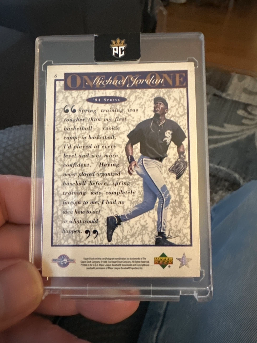 This is a 1994 Upper Deck baseball card featuring Michael Jordan during his Spring Training. It's from the '94 Spring collection. The card includes a quote from Jordan about his training experience.