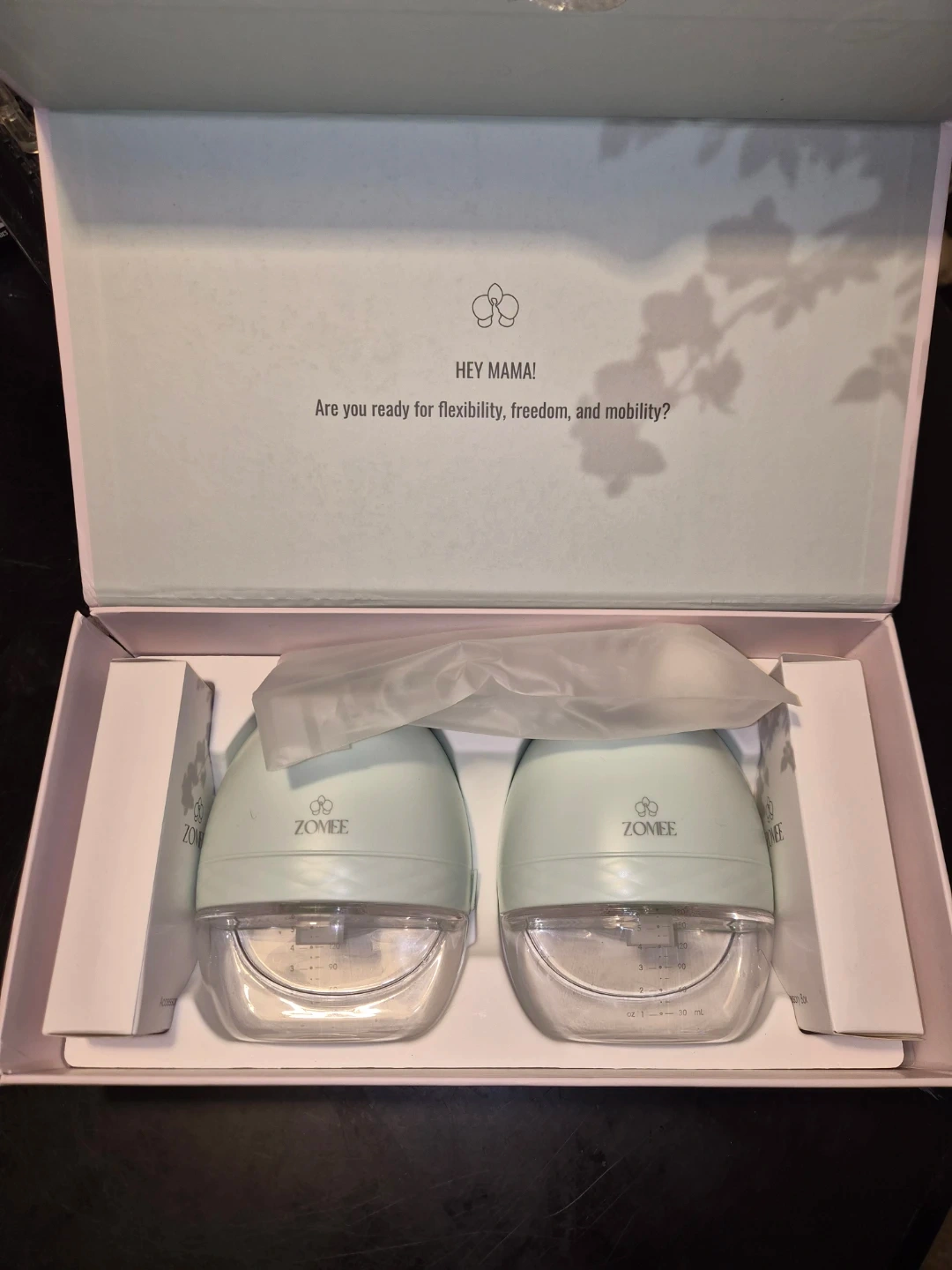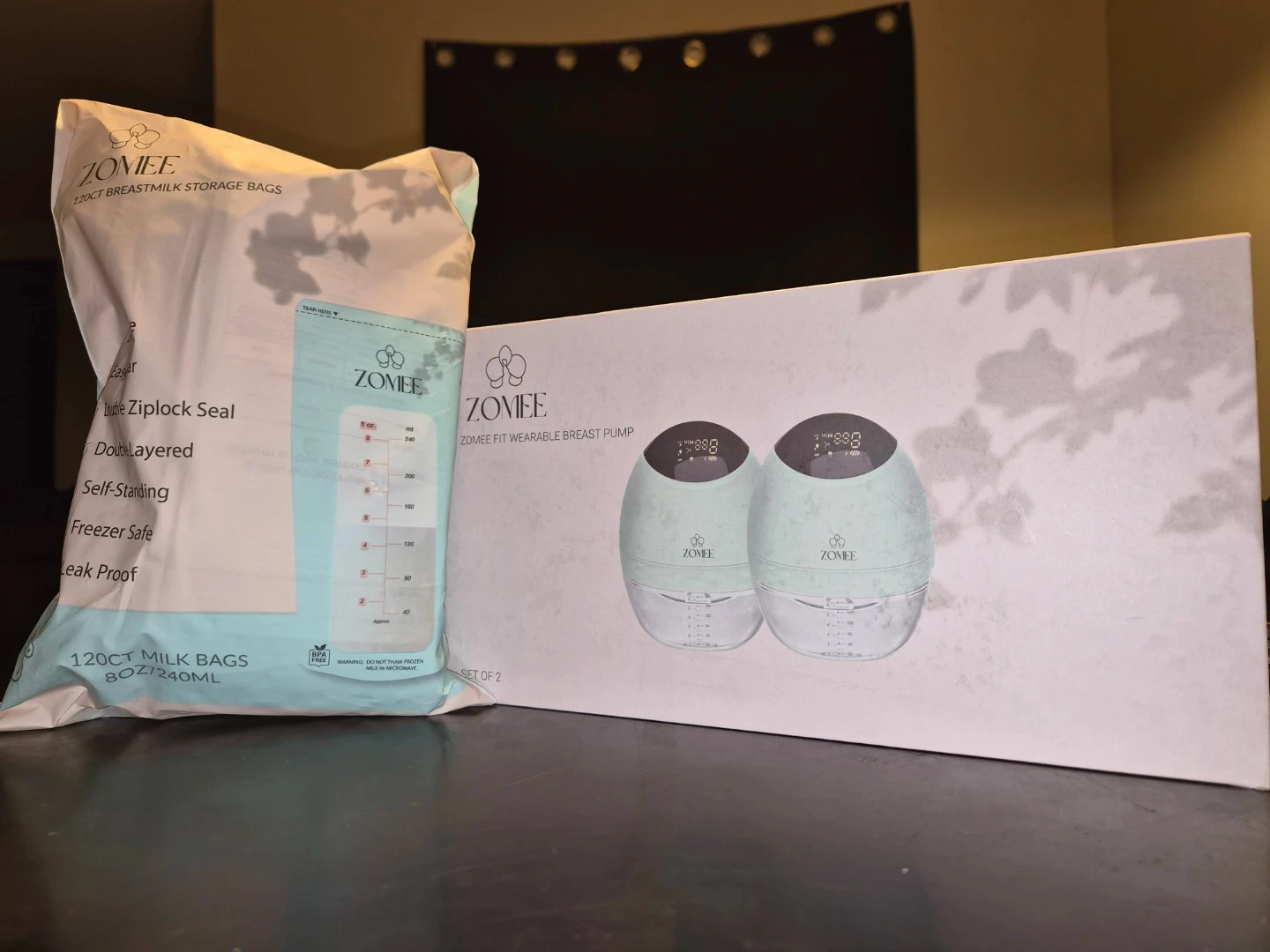 This is a set of two Zomée Fit wearable breast pumps, designed for flexibility and mobility. It also includes a bag of 120 Zomée breast milk storage bags, each holding 8oz or 240ml. The milk bags are BPA-free, leak-proof, and freezer safe.