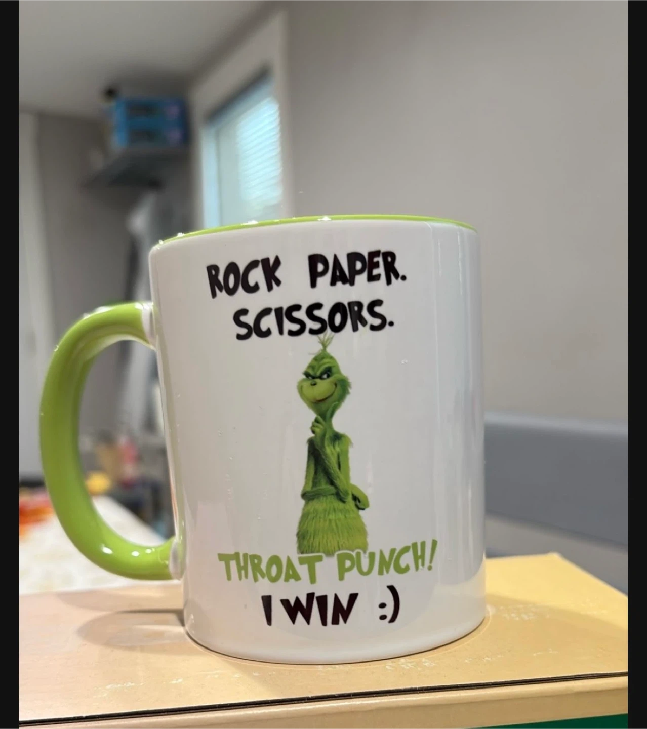 Selling a fun mug featuring the Grinch and the phrase "Rock Paper Scissors Throat Punch! I WIN :)". It's in great shape and ready for a new home!