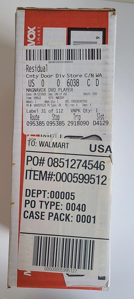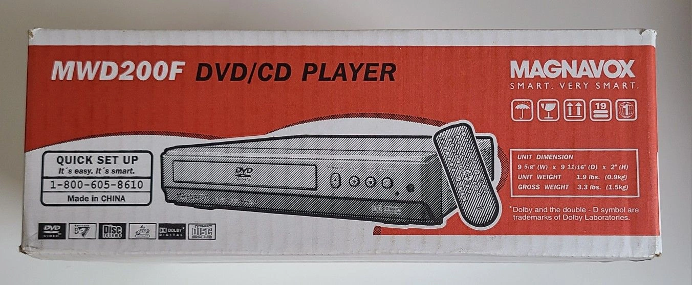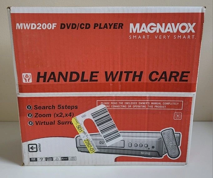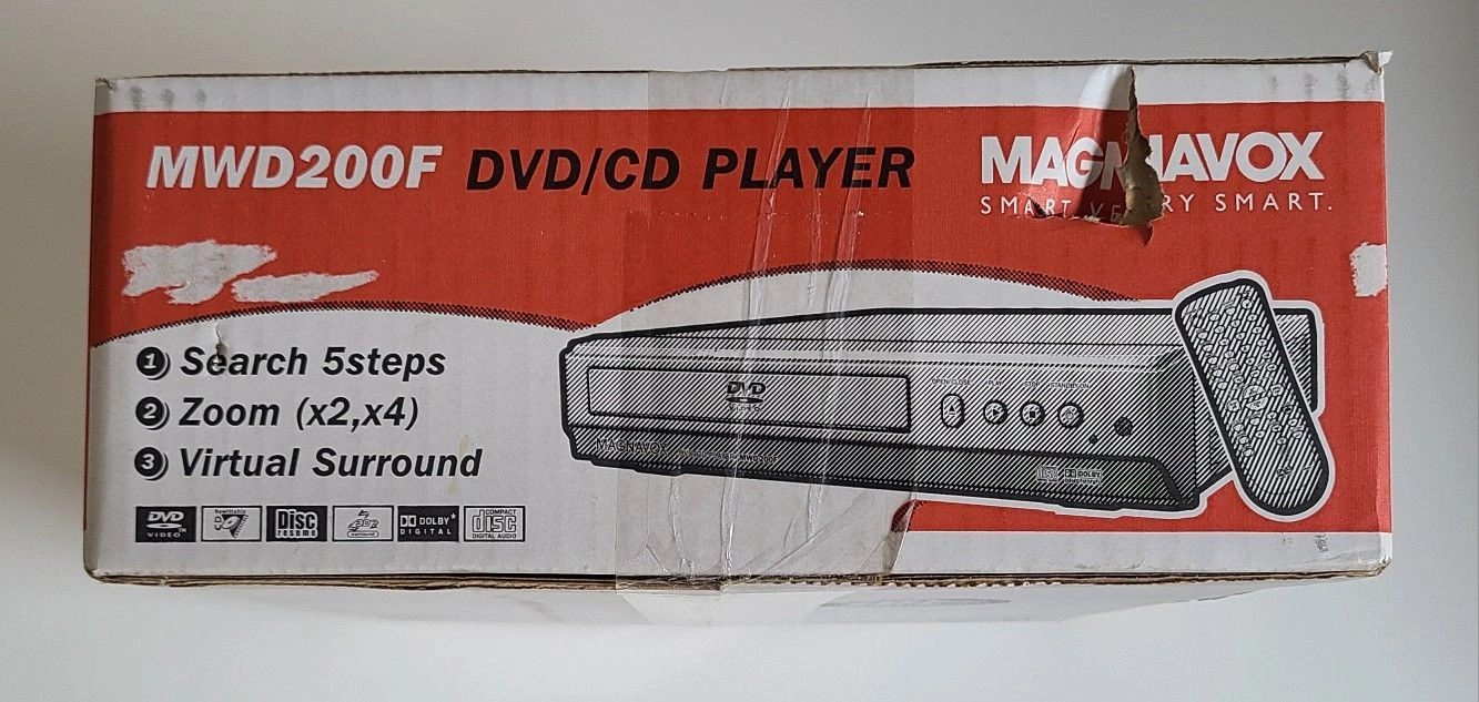 Magnavox MWD200F DVD/CD player with a remote control. It offers search, zoom, and virtual surround features. Box has moderate wear with a noticeable tear due to storage, but factory sealed and brand new.