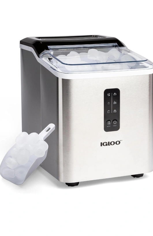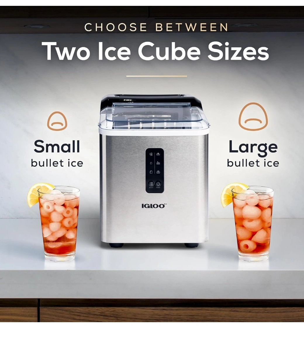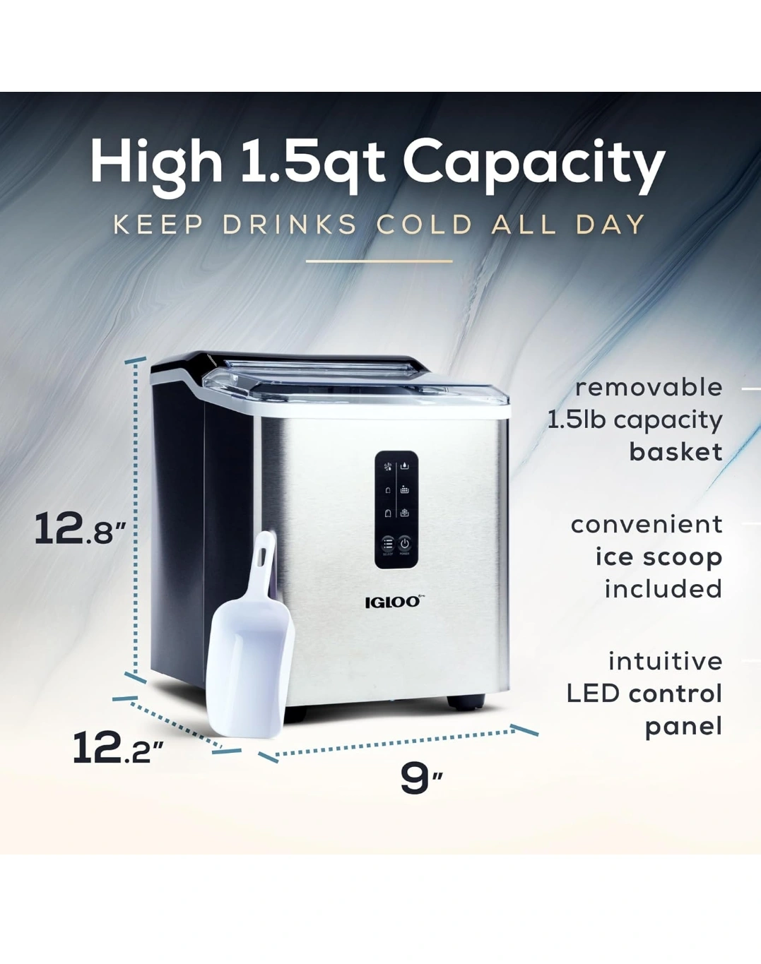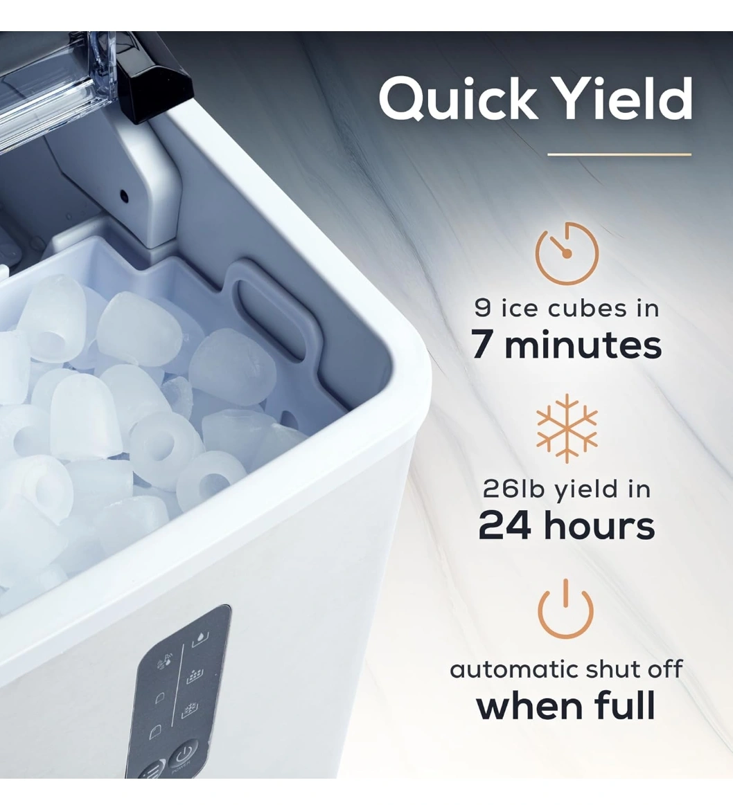 Makes 9 ice cubes in 7 minutes. 26lb of ice in 24 hours. Automatic shutoff when full. Two ice cube sizes. 1.5qt capacity. Removable 1.5lb ice basket. Includes ice scoop. Intuitive LED control panel.