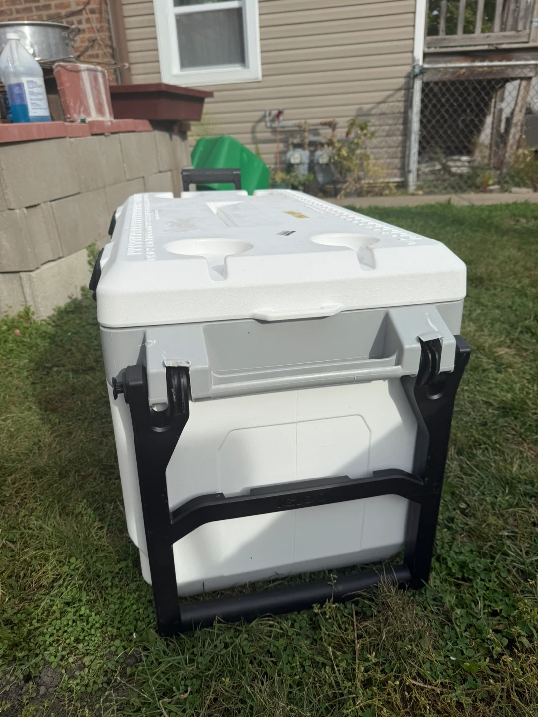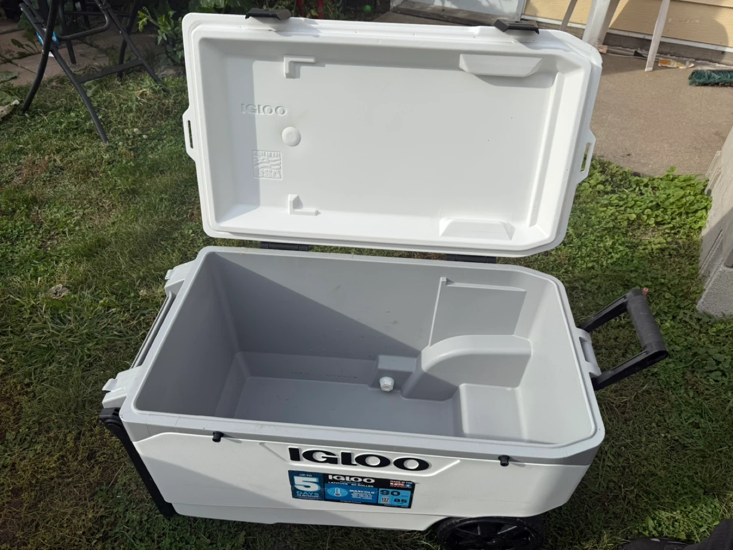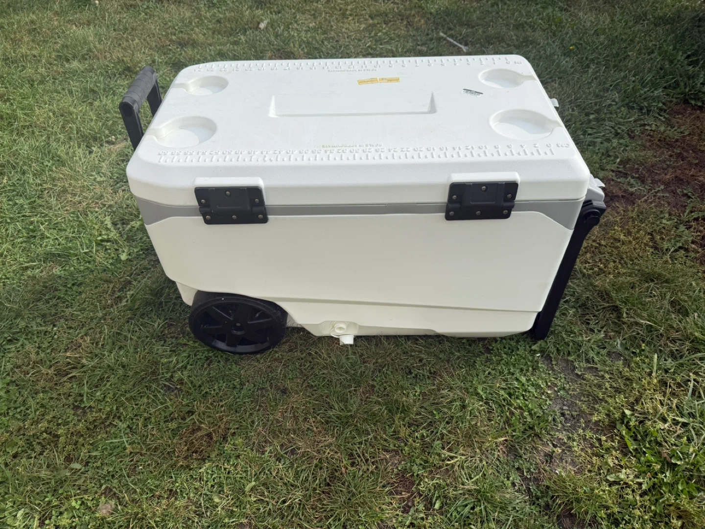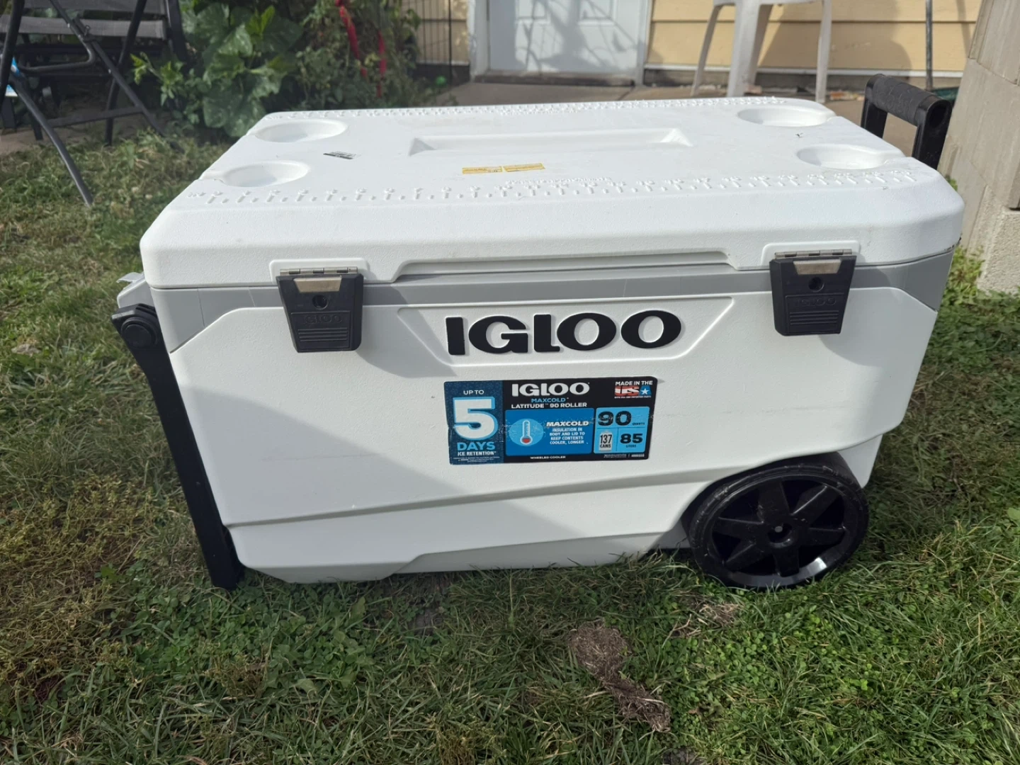 Selling an Igloo Latitude 90 Roller cooler in white. It's in great condition and ready for your next outdoor adventure! This cooler features: - MaxCold insulation for up to 5 days of ice retention - 90-quart capacity (holds up to 137 cans) - Wheels for easy transport