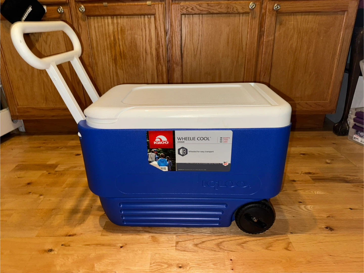 65Selling an Igloo Wheelie Cool cooler! It's blue and white and holds 38 quarts. It has wheels and a handle for easy transport.
