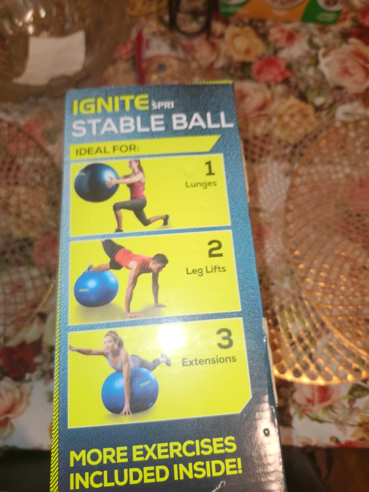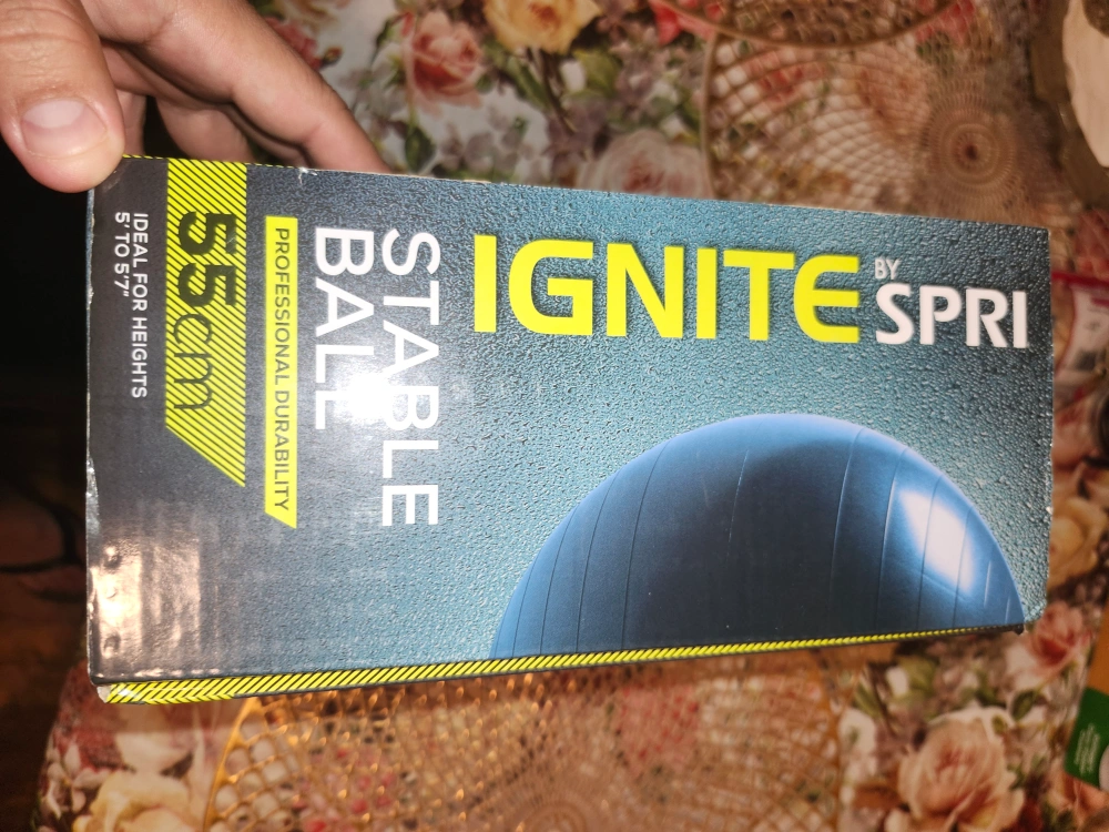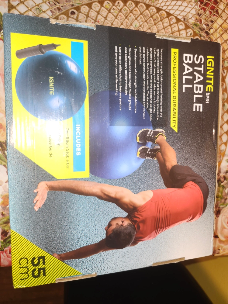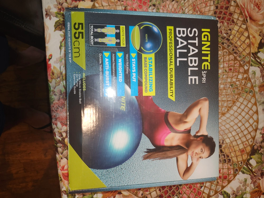 60Selling an Ignite by Spri stable ball, size 55cm. It's ideal for heights 5' to 5'7". The box mentions professional durability and anti-burst construction. Includes one 55cm stable ball and an exercise guide