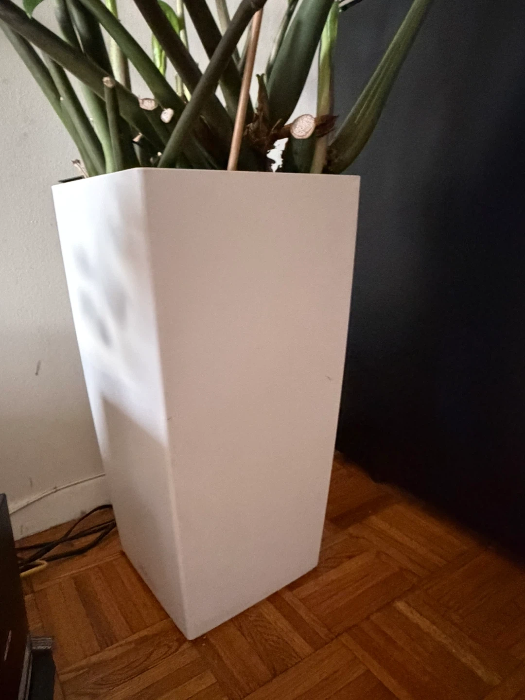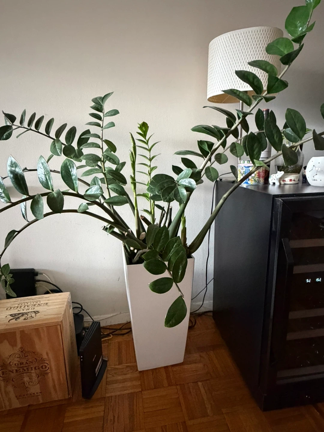 Modern Lechuza self-watering planter and a healthy ZZ plant housed . It's a low-maintenance plant that thrives in various light conditions. The planter adds a modern touch to any home or office decor.