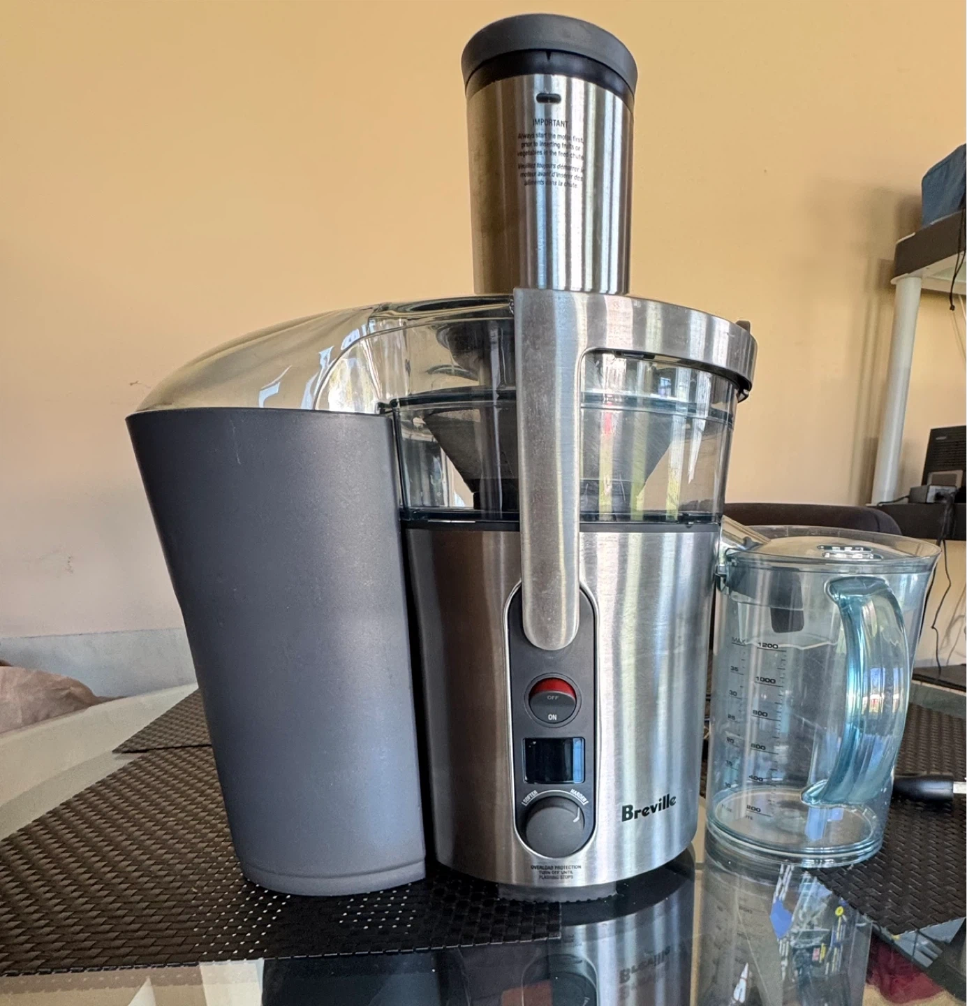 This Breville juicer is designed for efficient juice extraction. It features a wide chute for processing whole fruits and vegetables. A pulp container is included for easy cleanup. Stainless steel and plastic construction.