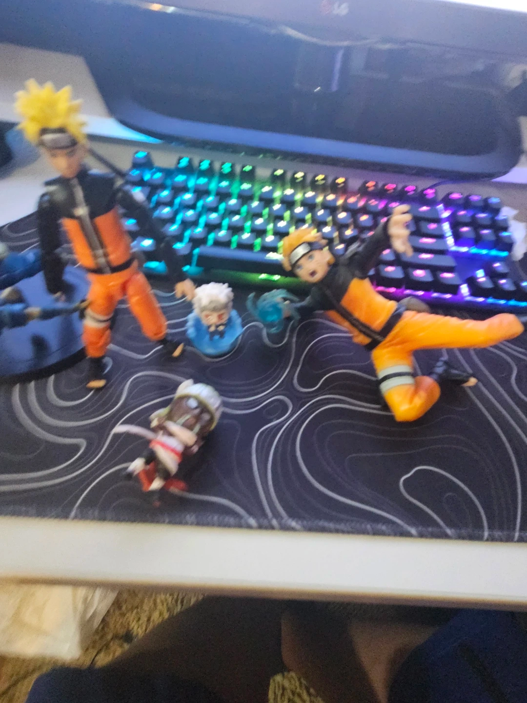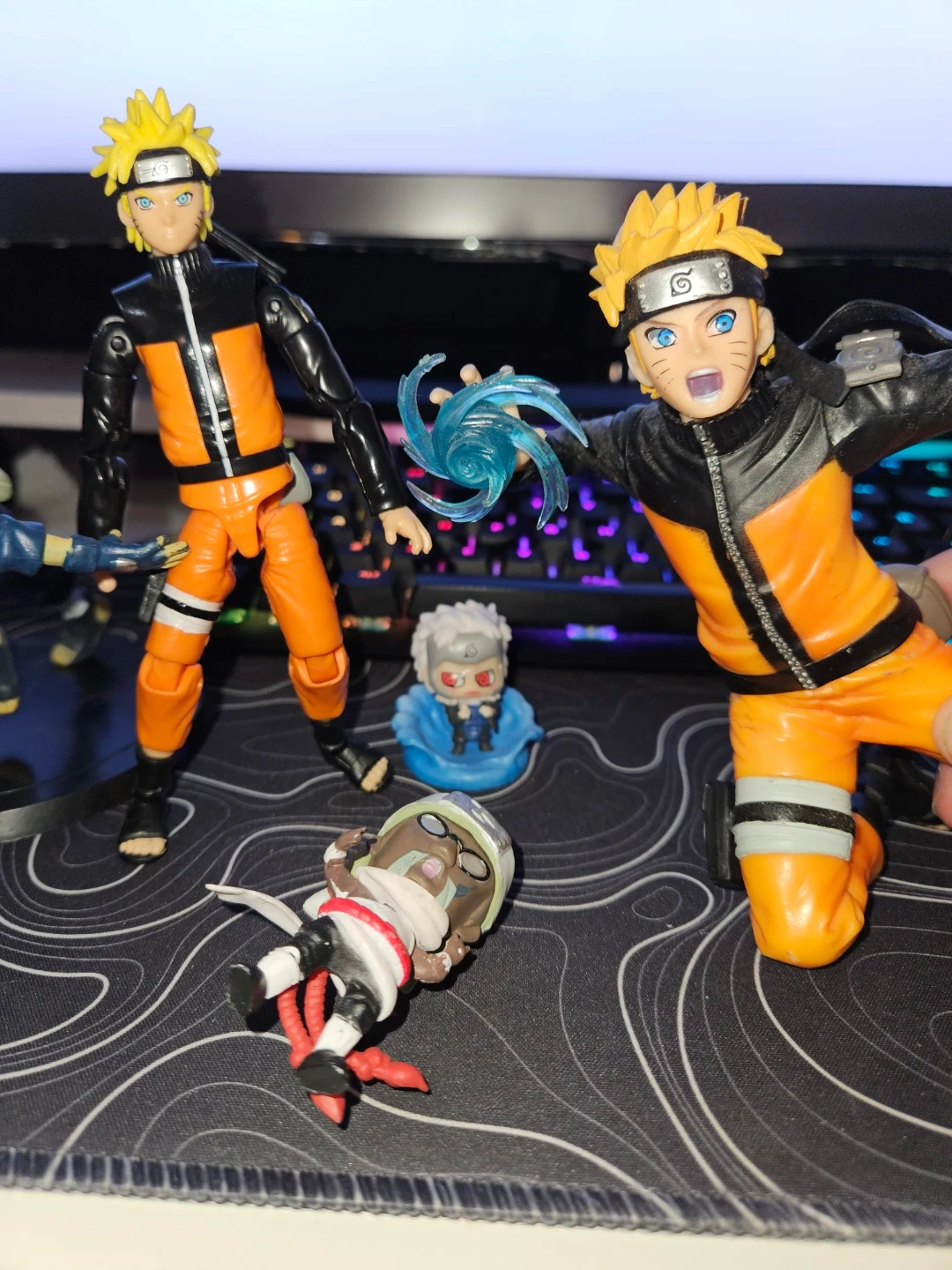 Set of Naruto and Kakashi action figures from the popular anime series. Includes additional smaller figures and accessories. Great for fans and collectors!